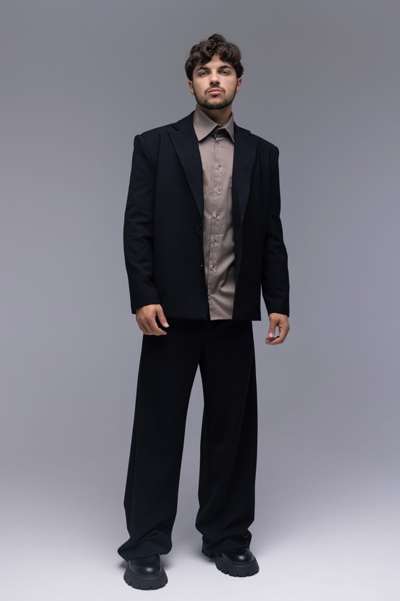 Męskie spodnie Lord w kolorze głębokiej czerni, o prostym kroju i szerokiej nogawce. Wykonane z miękkiej, lekko elastycznej tkaniny z domieszką wiskozy, zapewniającej komfort i elegancki wygląd. Mają praktyczne kieszenie boczne, zapięcie na guzik i zamek. Doskonale komponują się z oversize’ową marynarką z najnowszej kolekcji Ruffi.