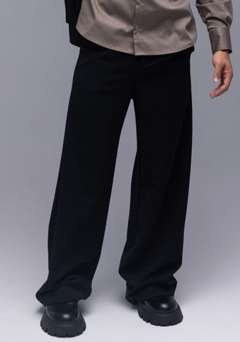 Prosta, szeroka nogawka (30 cm) nadaje im charakteru i lekkości, a jednocześnie podkreśla wyważony, męski krój. Wykonane z wysokiej jakości tkaniny - łączą miękkość, trwałość i subtelną elastyczność. Spodnie mają klasyczne kieszenie boczne, zapięcie na zamek i guzik, a ich konstrukcja zapewnia komfort w ruchu oraz swobodne dopasowanie do sylwetki. Czarny, matowy materiał pięknie układa się w ruchu i nie traci formy podczas noszenia.