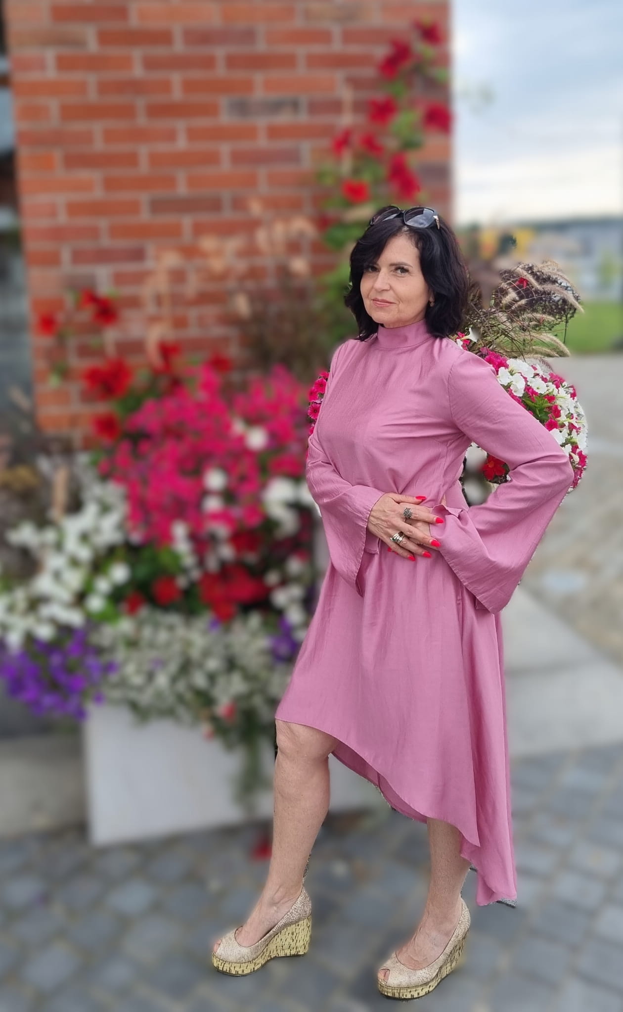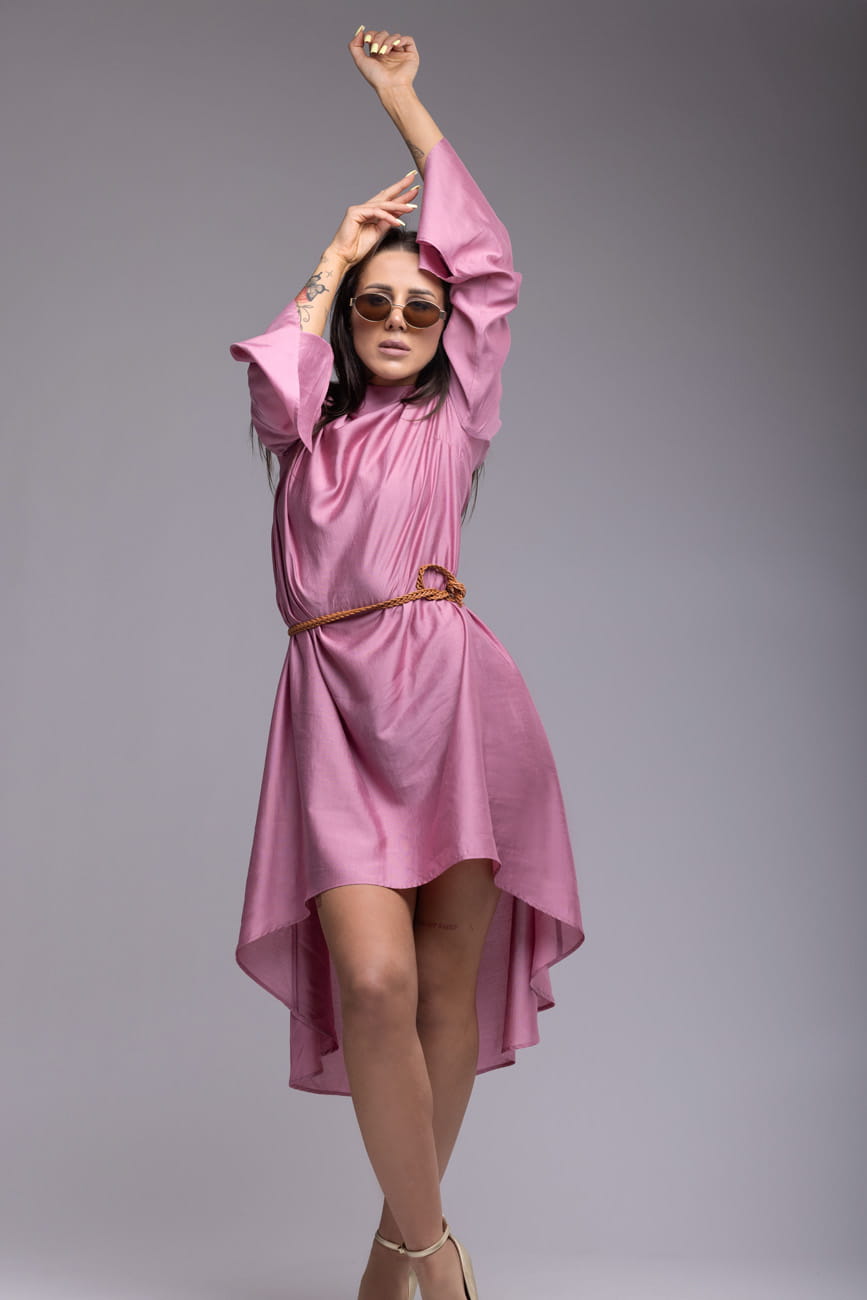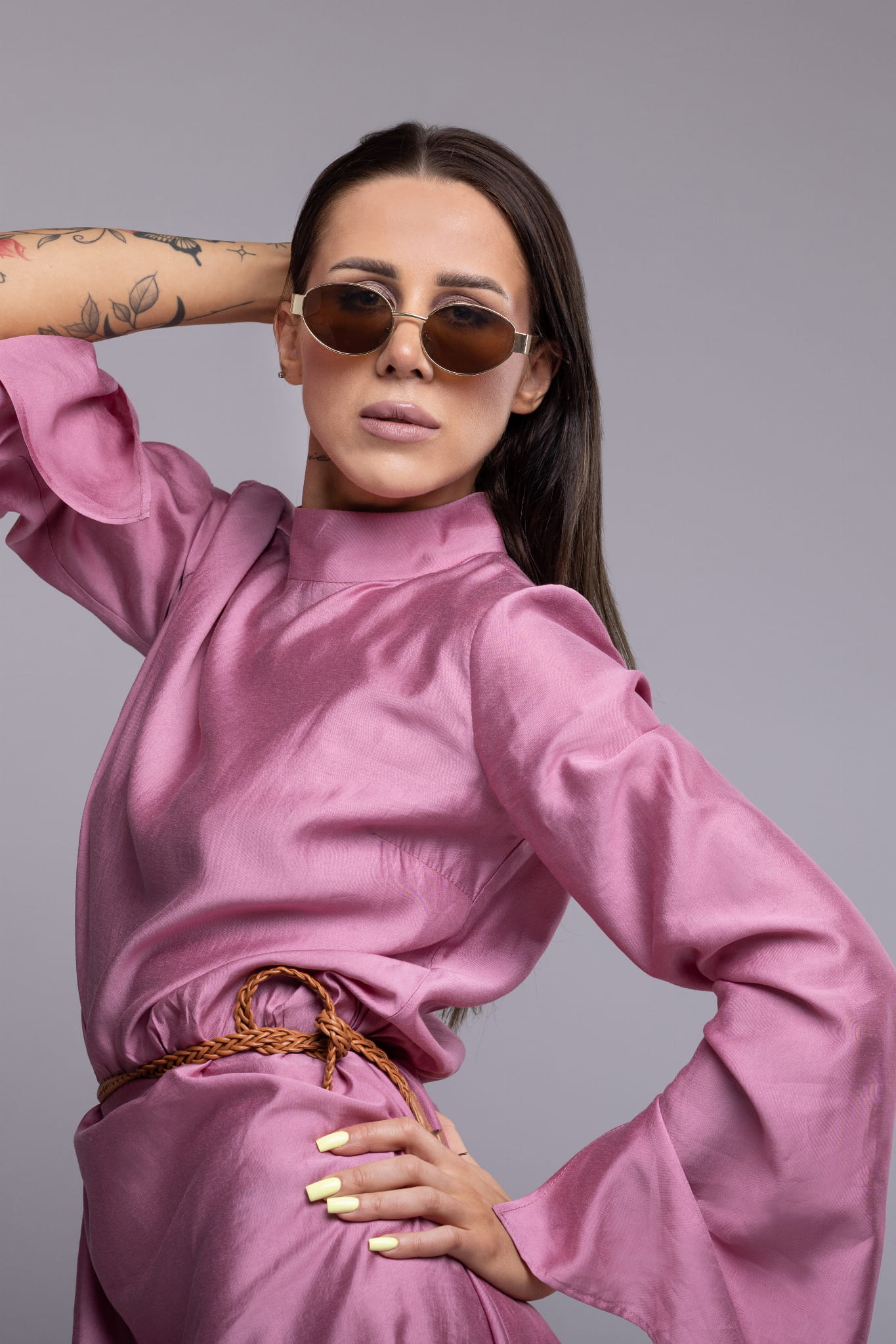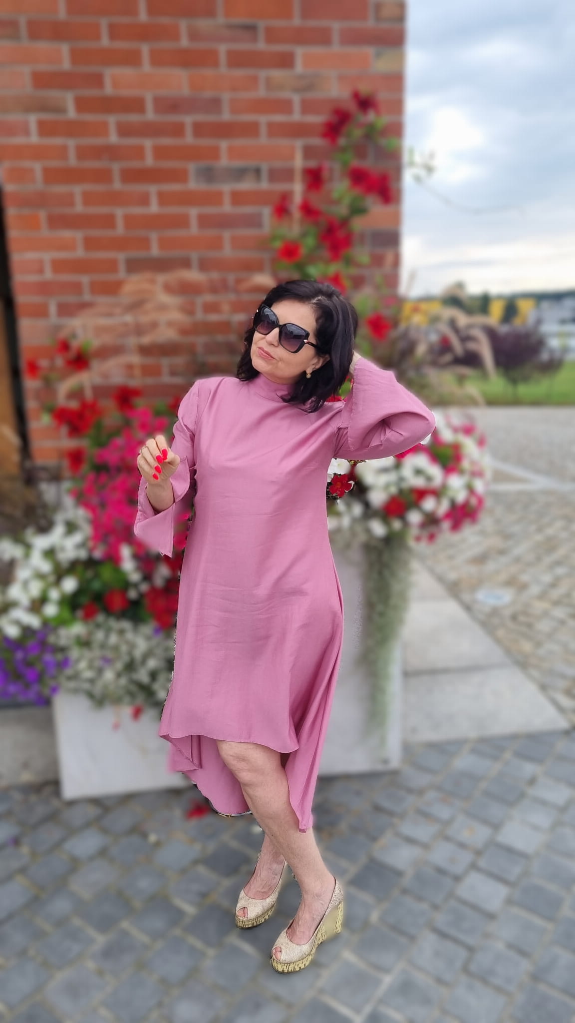 Tunika Rosegold w kolorze delikatnego brudnego różu z satynowym połyskiem to propozycja dla tych, którzy lubią połączenie klasyki i nowoczesnego sznytu. Minimalistyczna stójka podkreśla szyję i dodaje konstrukcyjnej elegancji, a szerokie, wydłużone rękawy z rozcięciami tworzą lekkość w ruchu i nieoczywisty detal. Wydłużony tył płynnie układa się na sylwetce, dodając tunice charakteru i nonszalanckiej elegancji. To projekt, który sprawdzi się solo lub jako warstwa – dla kobiet, które lubią tworzyć swój własny rytm stylu.
