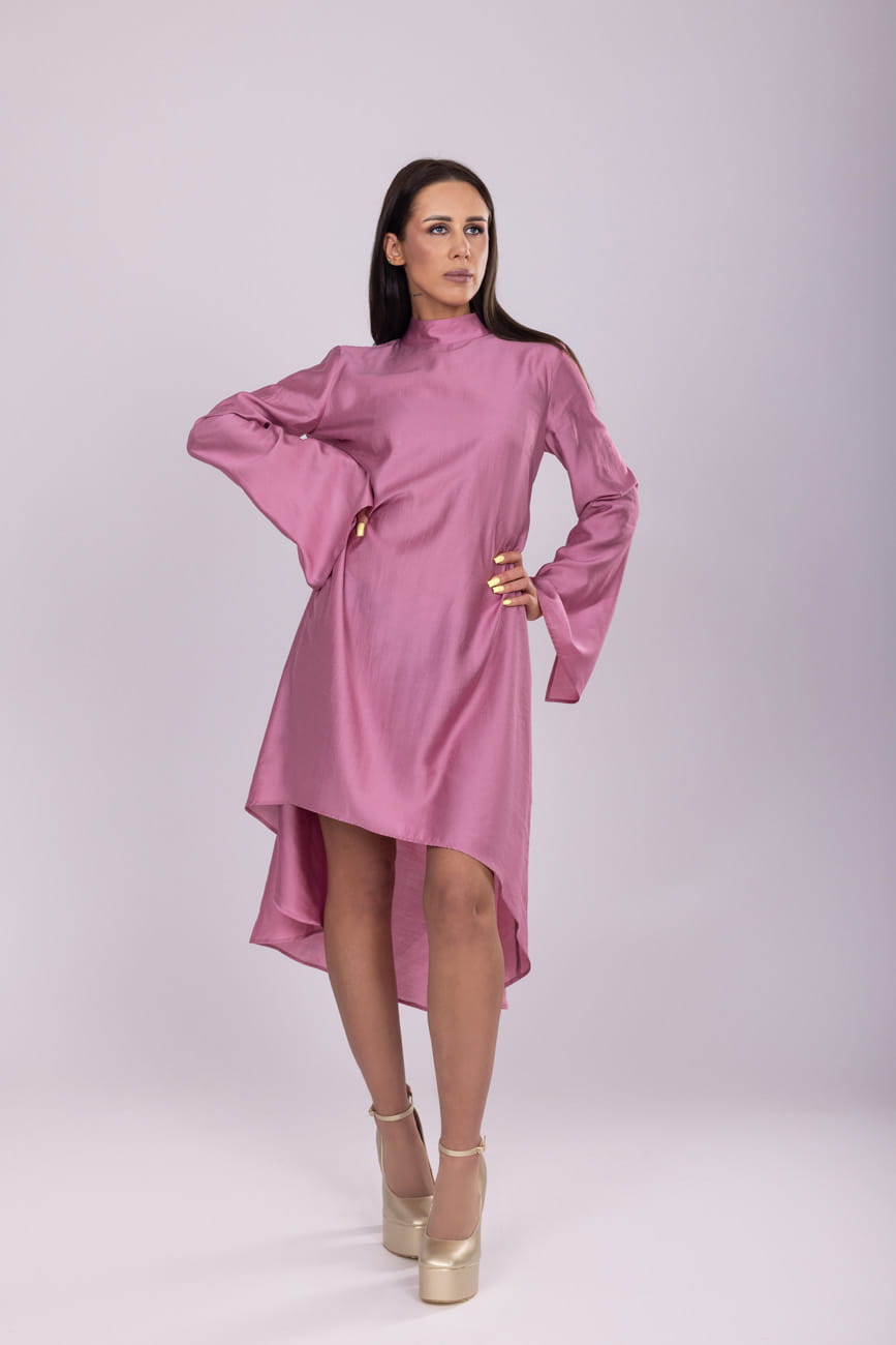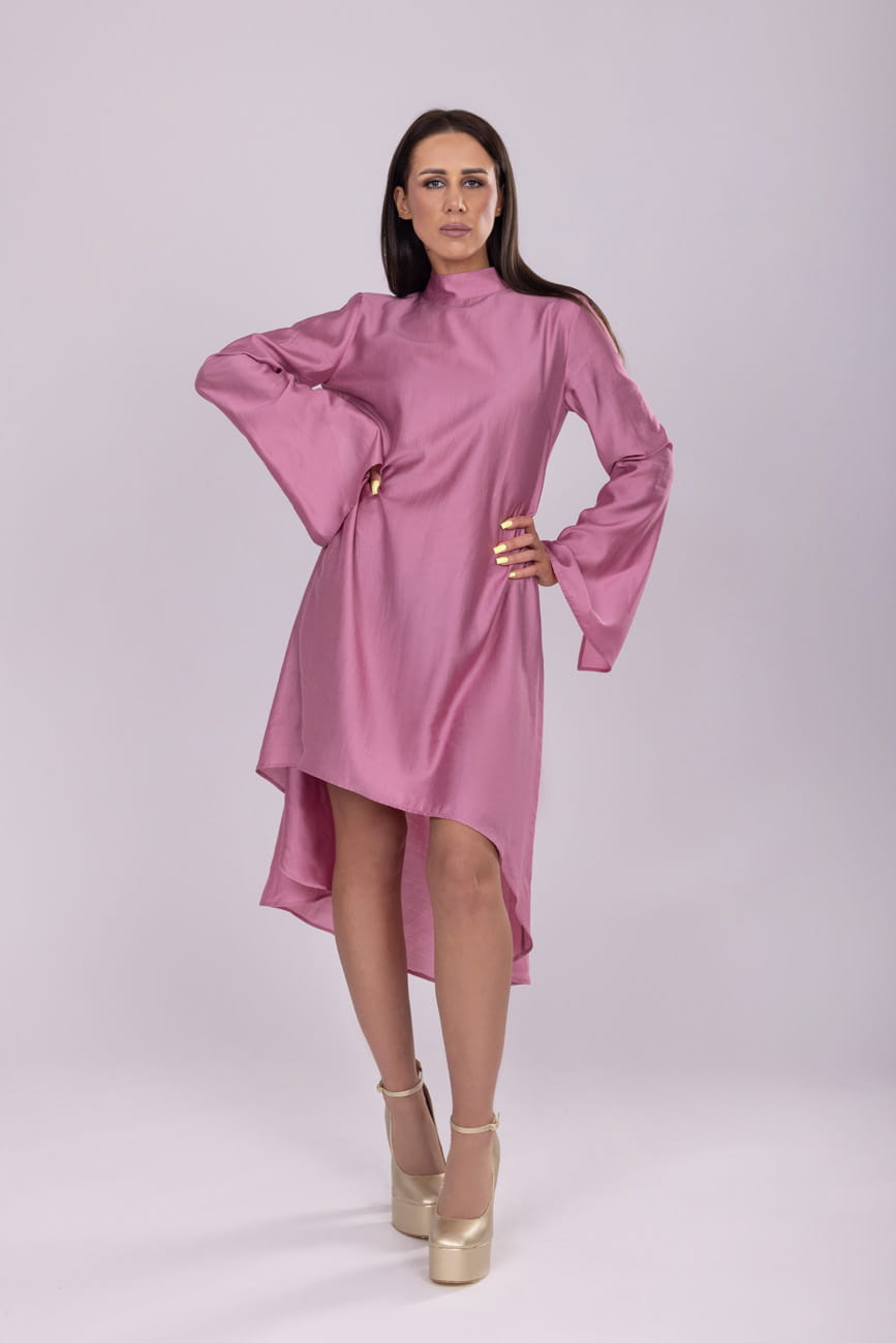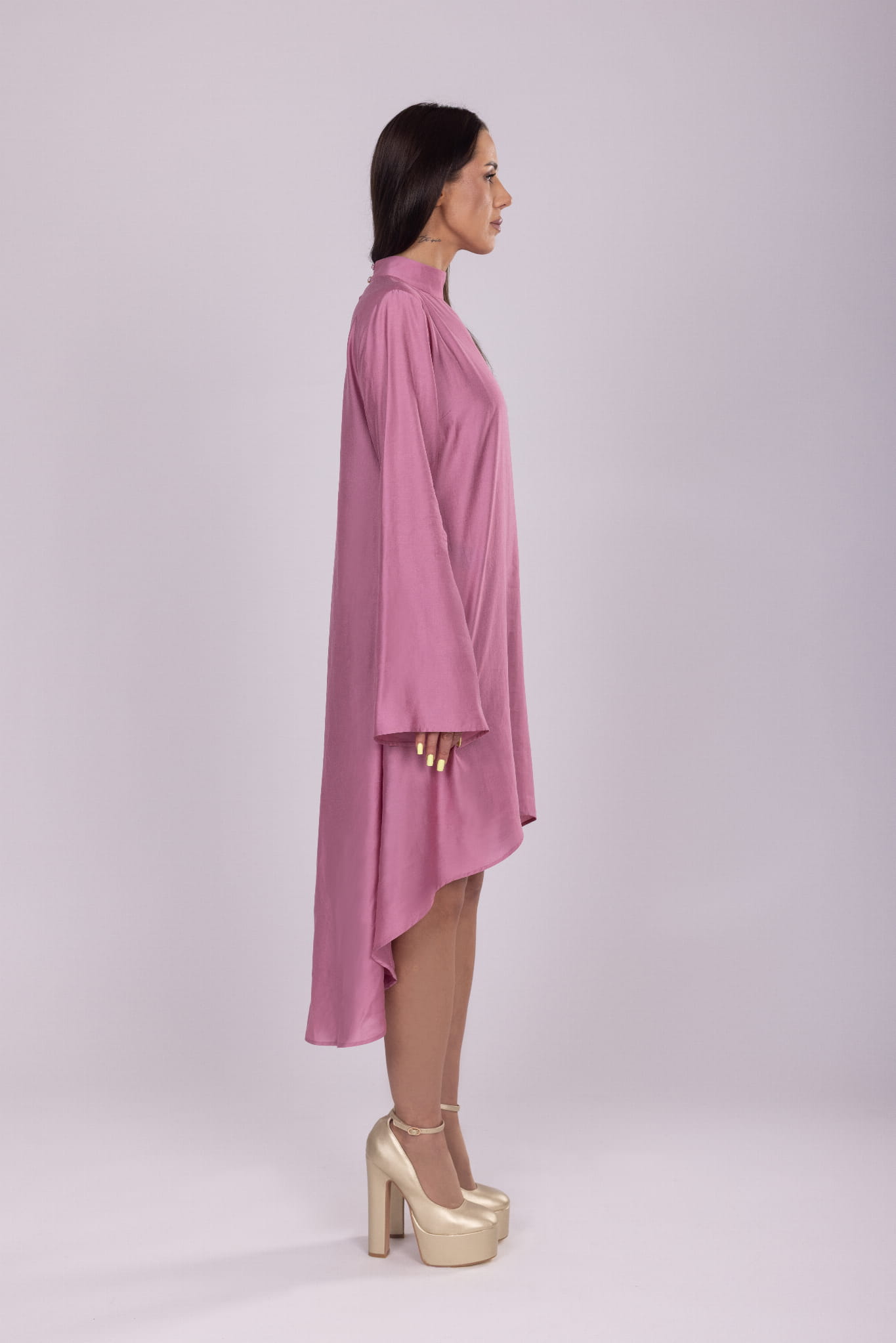 Tunika damska Rosegold - brudny róż, asymetryczna, długi rękaw z rozcięciem, stójka na guziki, lyocell