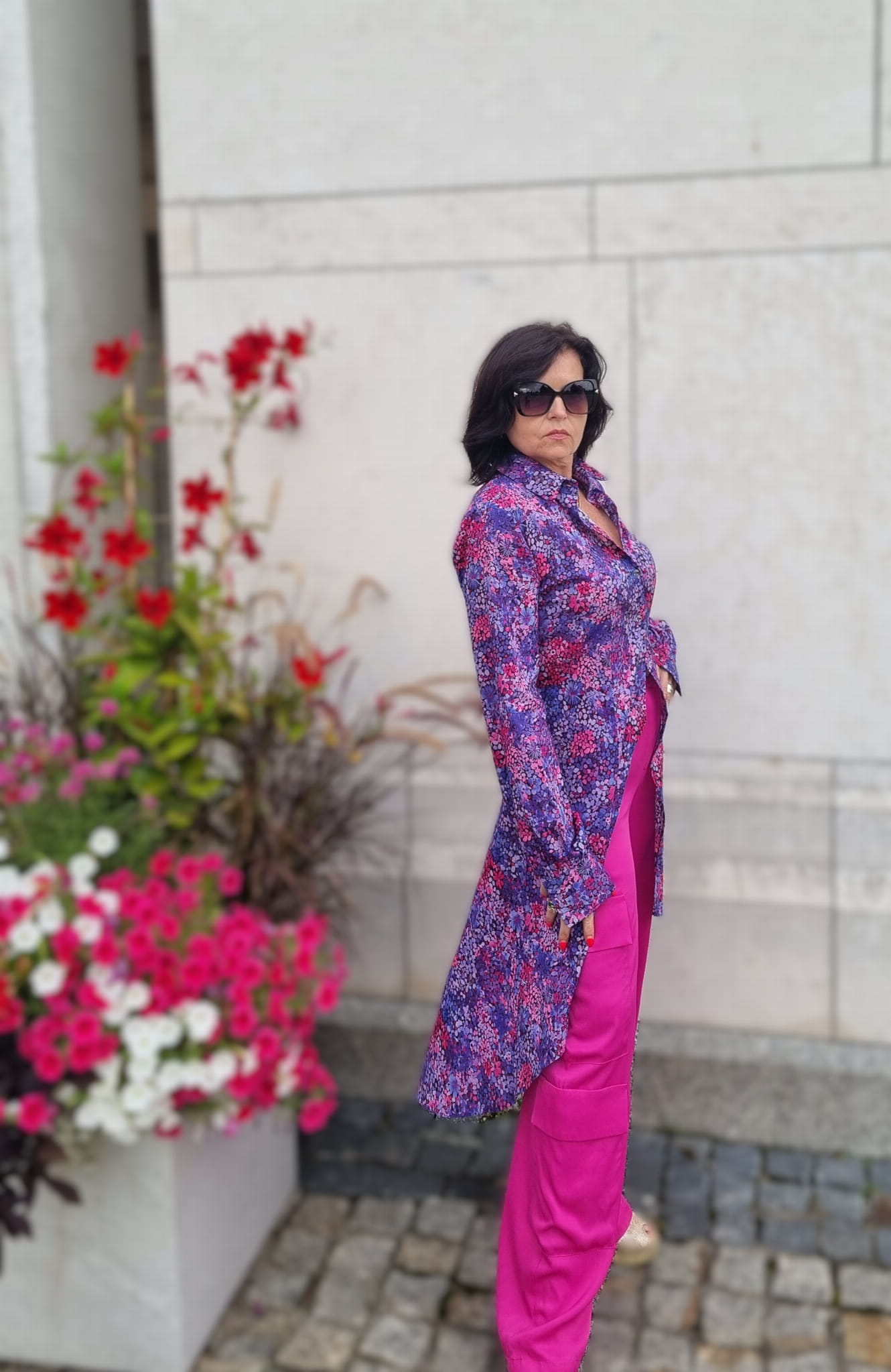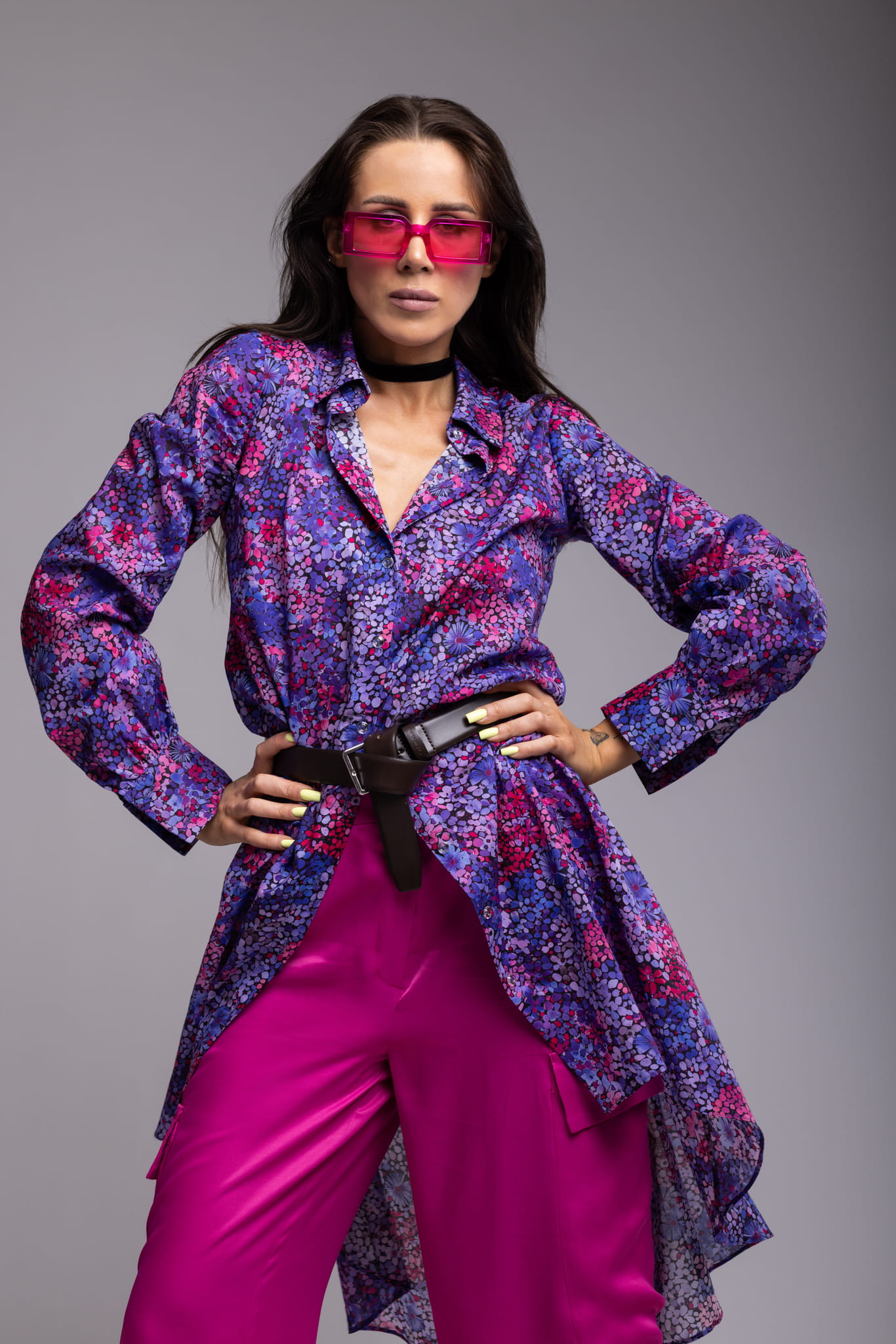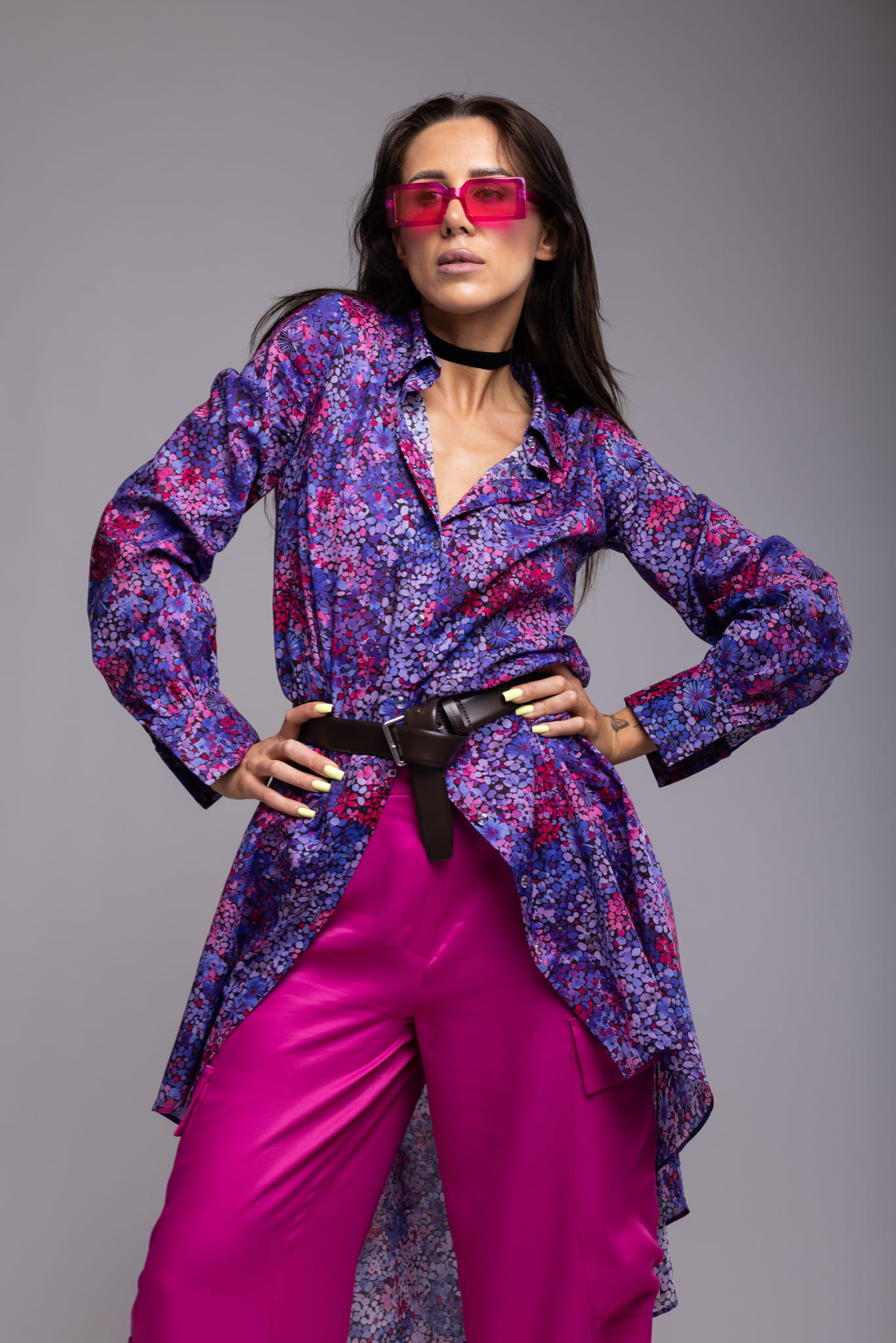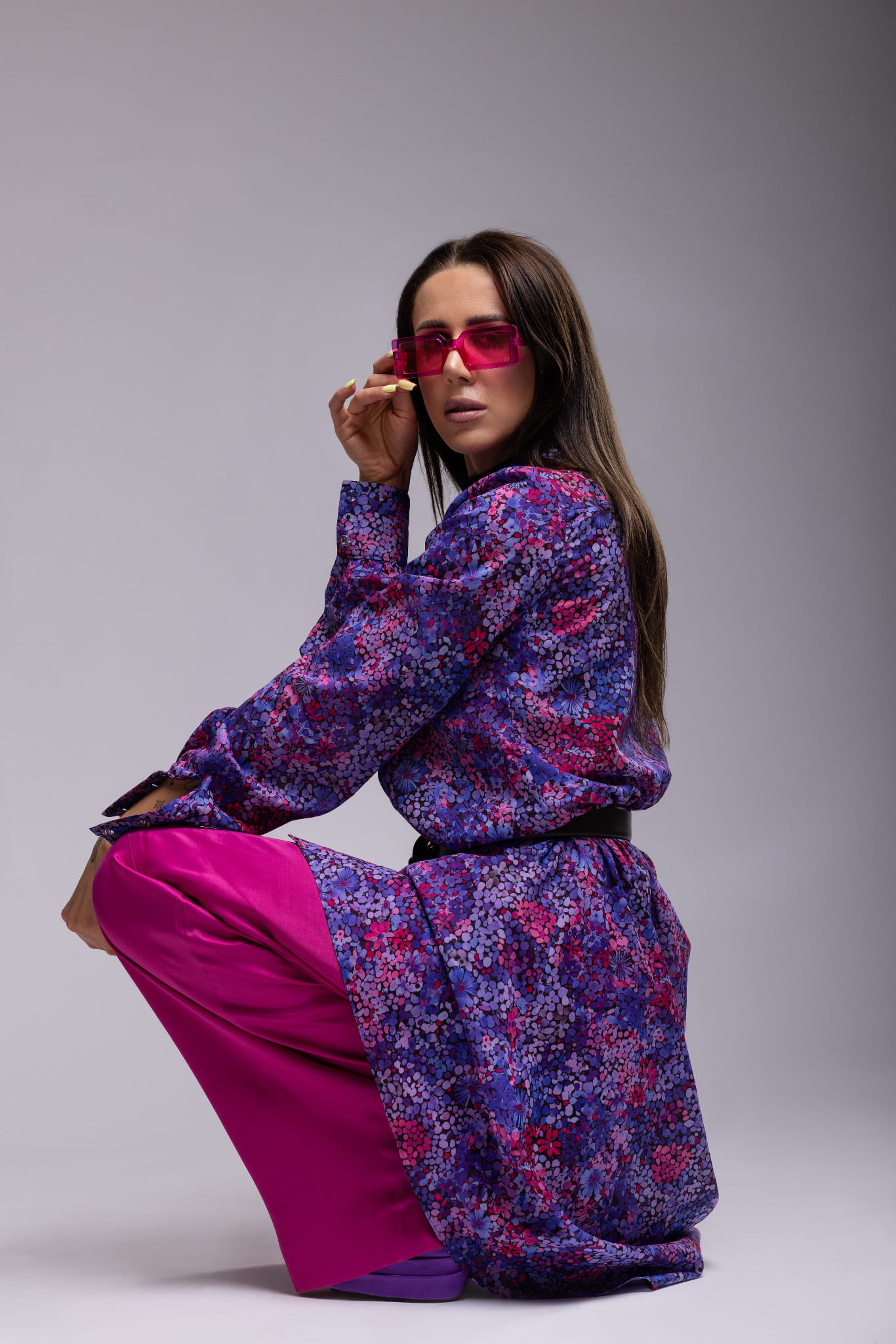 W tej koszuli nie przejdziesz po ulicy nie zauważona. Violet Bloom to długa, kobieca koszula, uszyta z lekkiej, półtransparentnej bawełny, otula sylwetkę niczym powietrze – subtelnie, miękko, naturalnie. Luźniejszy krój, krótki przód zapinany do pasa na guziki i długi tył sprawia, że jest niepowtarzalna – koszula wygląda świetnie zarówno solo, jak i z paskiem, podkreślając talię. Dopracowana w każdym szczególe: przezroczyste guziki stapiają się z tkaniną, szerokie mankiety i klasyczny kołnierzyk dodają lekko boho, ale wciąż ponadczasowego charakteru.