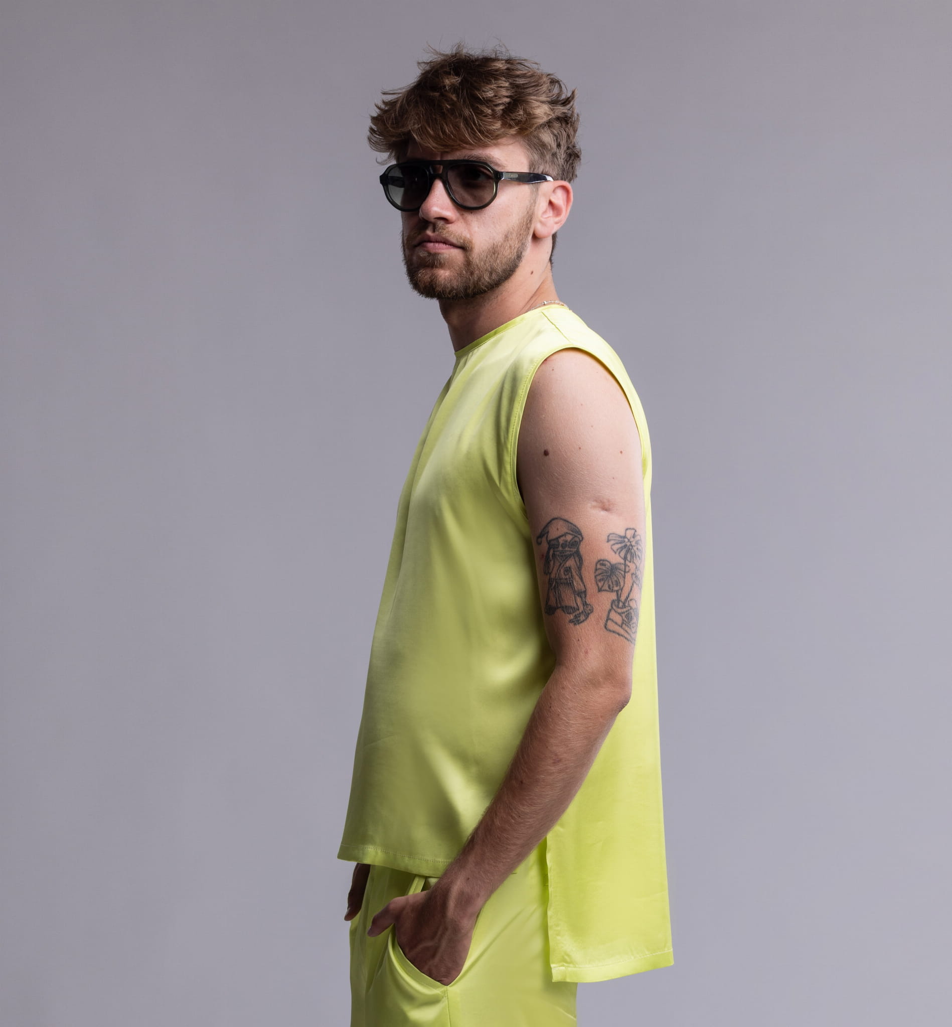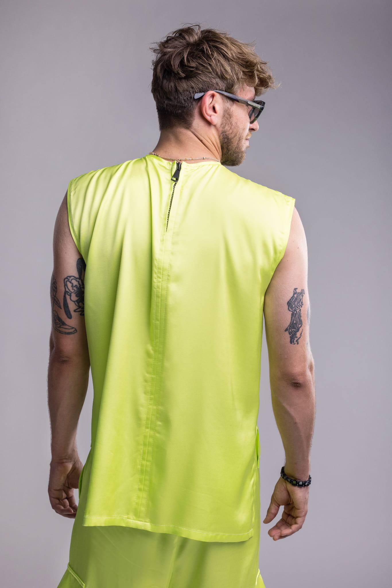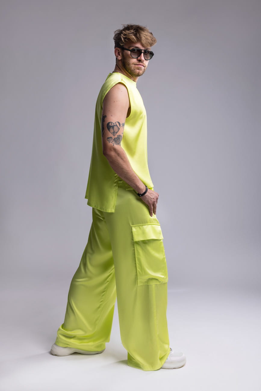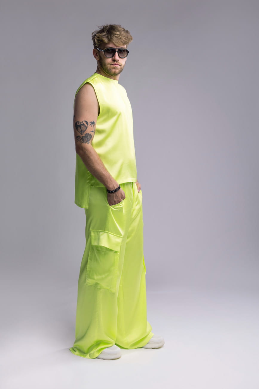 Męski tank top Neon Ray to minimalistyczna forma z wyrazistym charakterem. Uszyty z chłodnej, lejącej wiskozy w intensywnym neonowo-seledynowym kolorze, przyciąga uwagę asymetrycznym dołem, rozcięciami po bokach i dekoracyjnym zamkiem z tyłu. Idealnie komponuje się ze spodniami z tej samej kolekcji – zarówno seledynowymi, jak i czarnymi. Wybierz go, jeśli szukasz stylu, który mówi więcej, niż słowa.