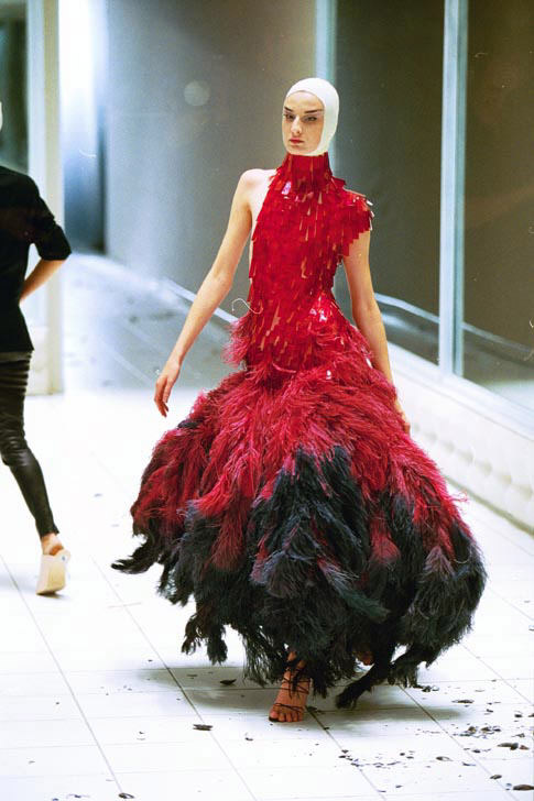 Modele mieli owinięte głowy opatrunkami, ich ruchy były nerwowe — manifest szaleństwa, wewnętrznego zamknięcia, frustracji. 77 looków: od elegancji do makabry - McQueen zaprezentował m.in. garnitury, sukienki zdobione muszlami kąkolnic, piórami strusimi, o biżuterii imitującej ptaki drapieżne (w tym nad głową Jade Parfitt „atakujące” modele). Nie brakowało surrealistycznych akcentów: zrekonstruowane miniatury zamków, puzzle, ekscentryczne kapelusze i stroje z frędzlami przypominającymi pajęczyny. Erin O’Connor nosiła sukienkę ze struganych muszli razor clam — miała je zamanifestować rozbicie, rozrywanie i traumę: rozedarte fragmenty sukni stanowiły część performansu, a modelka doznała drobnych skaleczeń rąk w trakcie prezentacji. Ostatnia stylizacja: **Suknia z piór i mikroskopowych szkiełek** - strusie pióra barwione na czerwono i czerń oraz ponad 2000 pomalowanych na czerwono szkiełek laboratoryjnych (microscope slides), symbolizujących... krew pod ludzką skórą. McQueen powiedział: „There’s blood beneath every layer of skin.” - „Pod każdą warstwą skóry płynie krew.” - Cytat podkreśla, jak McQueen dopuszczał widza do intymnej, wręcz niepokojącej konfrontacji z fizycznością i emocjami ukrytymi pod pozorną estetyką.