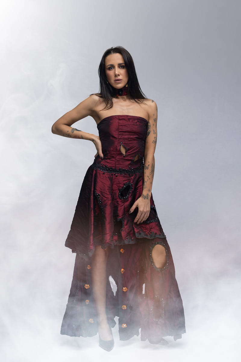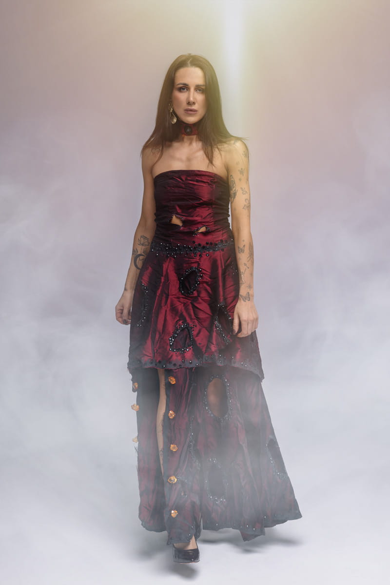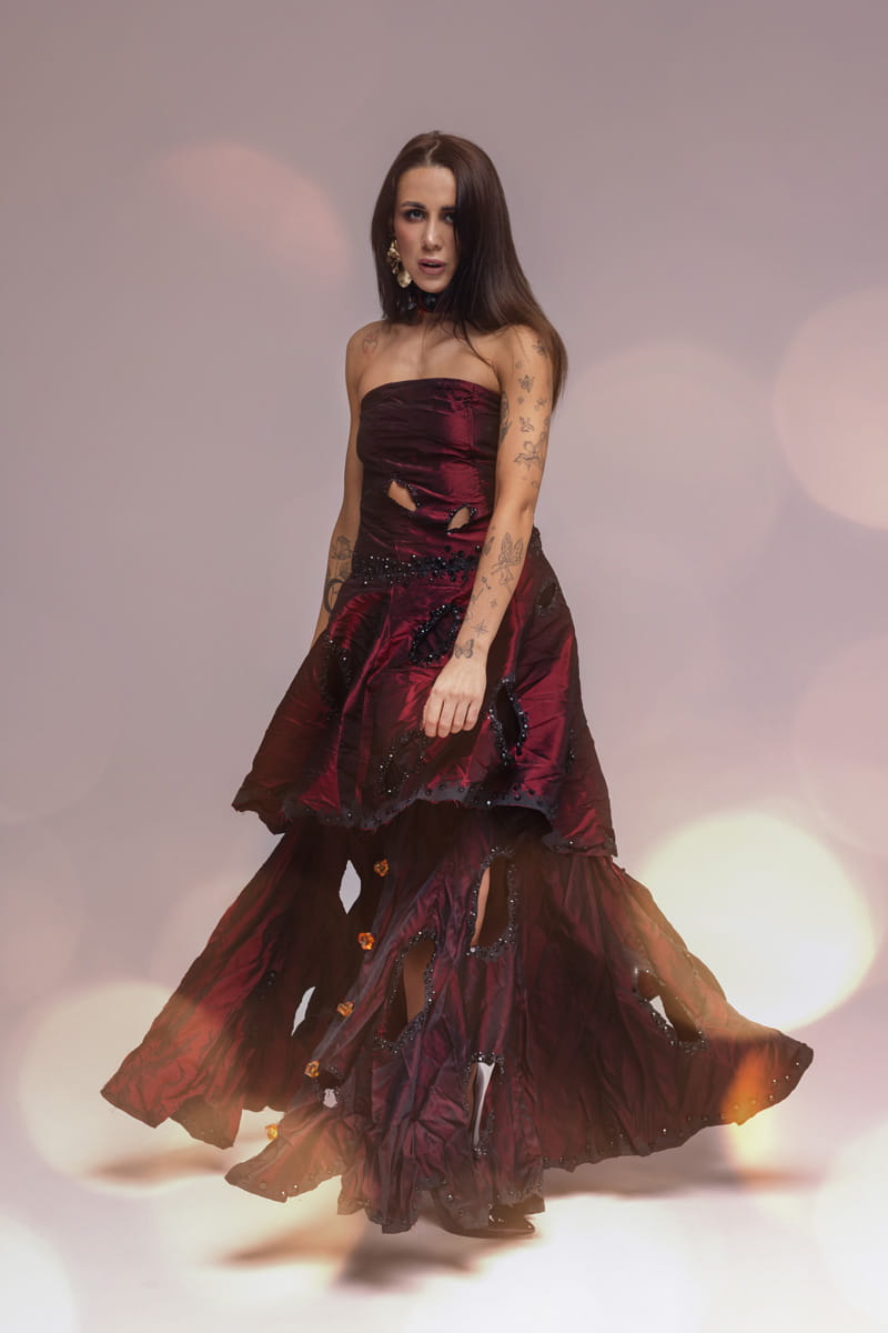 Choć tkanina wydaje się zniszczona, wszystko jest dopracowane w najmniejszym szczególe - forma, kolory, rozmieszczenie ozdób – wszystko współgra, tworząc obraz emocji, nie doskonałości. Borned Gown nie próbuje być piękna w klasycznym sensie. To suknia o odwadze – o sile tworzenia, o zniszczeniu, które potrafi być początkiem. O pięknie, które potrafi narodzić się nawet z tego, co zostało spalone. To suknia, która nie potrzebuje sceny, bo sama nią jest. Film