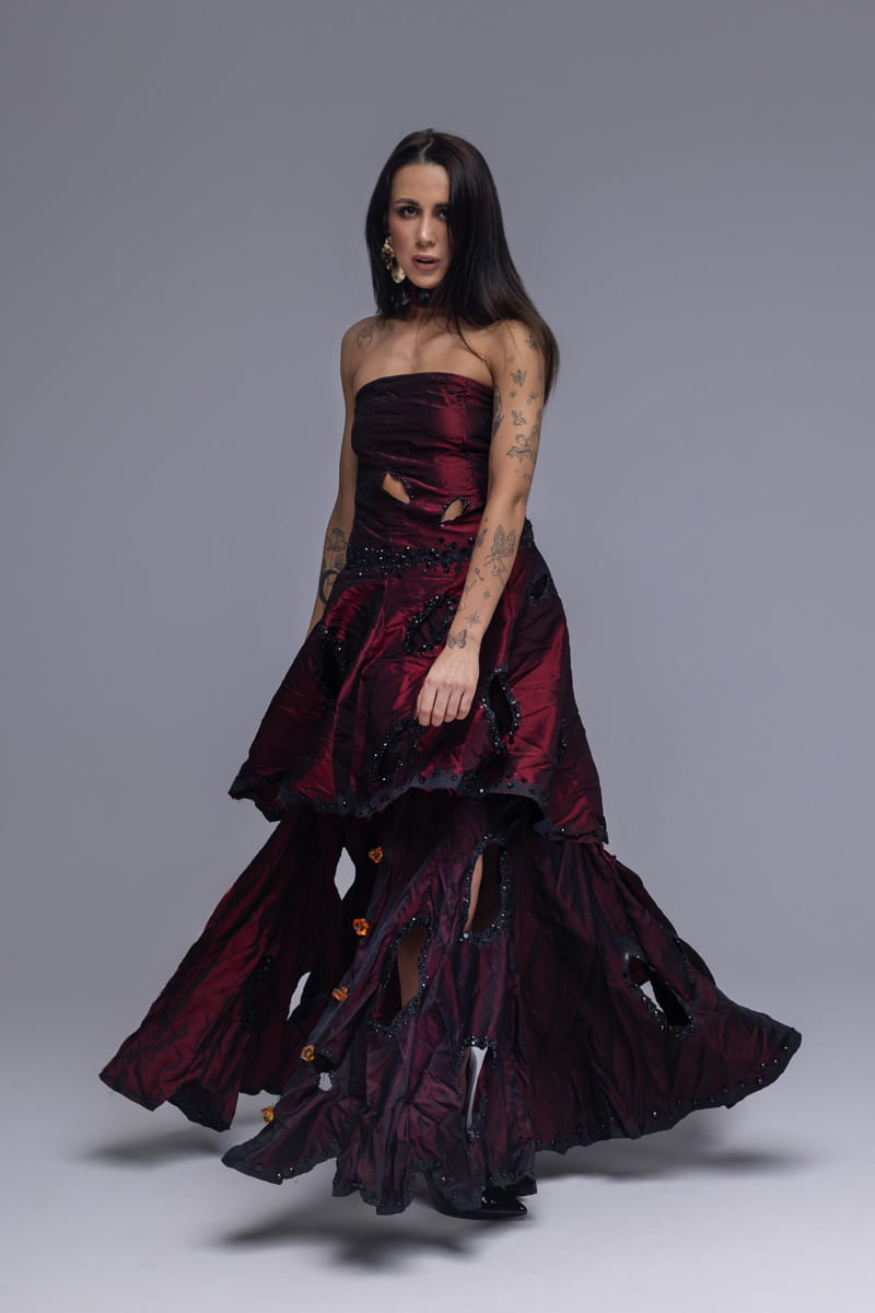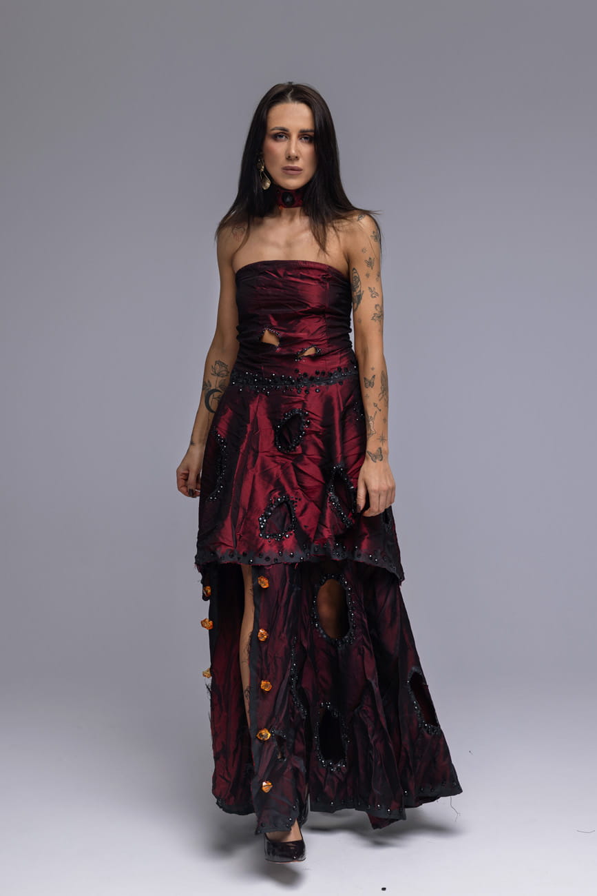 Jej bordowa, lekko kreszowana tkanina przypomina wypalone jedwabie – jakby dotknął ich żar namiętności, nosi na sobie dziury, ślady nadpaleń i przebarwień, jak wspomnienia po czymś, co już się wydarzyło. Lecz …. każde z nich jest perfekcyjnie opracowane, obszyte drobnymi kamyczkami, które niczym popiół zamieniają ranę w ozdobę, które błyszczą subtelnie, jakby chroniły miejsca, gdzie materiał został dotknięty żarem. Pomiędzy przetarciami błyszczą większe kamienie – przypominają iskry, które zatrzymały się w ruchu, zanim zgasły.