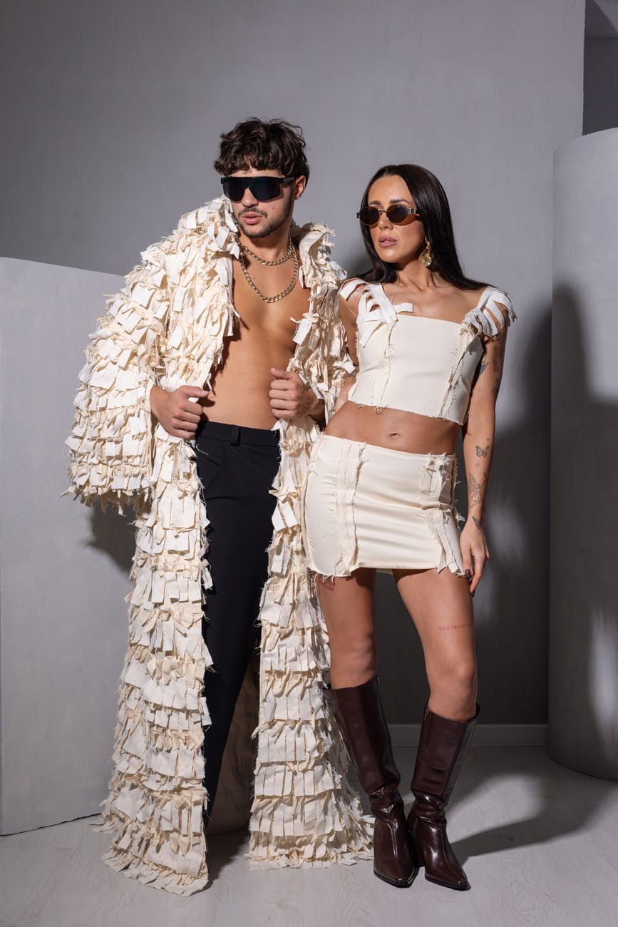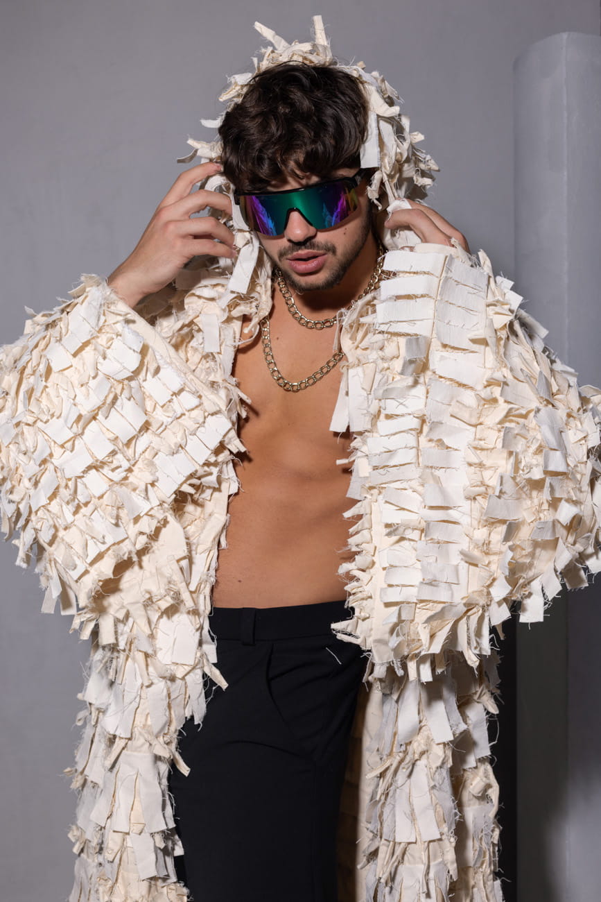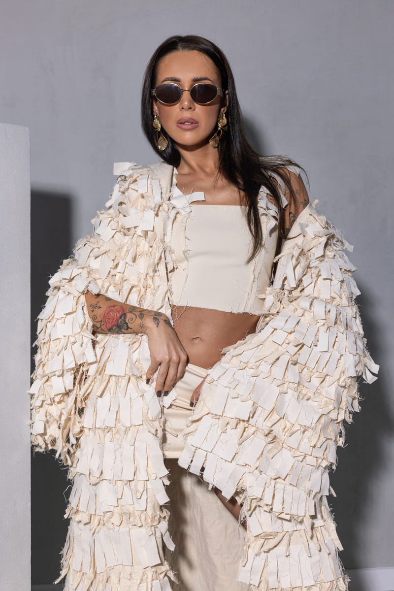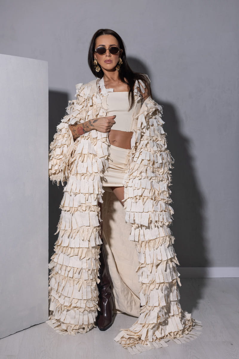 to projekt, który wymyka się tradycyjnym kategoriom mody. Powstał nie po to, by go nosić, ale by wyrazić ideę – surowe piękno, autentyczność i wolność tworzenia. To praca artystyczna, w której tkanina stała się formą wypowiedzi, a niedoskonałość – środkiem wyrazu. Długi, obszerny płaszcz z głębokim kapturem i szerokimi rękawami. Powstał z surowej bawełnianej tkaniny ciętej na pasy i frędzle, które układają się jak miękkie, nieregularne futro. Każdy element został uformowany tak, by zachować naturalny rytm i lekkość ruchu. Pod spodem – mini spódniczka i gorset z tej samej tkaniny, z widocznymi przeszyciami i surowymi krawędziami. Proste formy, szczere wykończenie, brak ukrytych detali – wszystko pozostaje autentyczne.