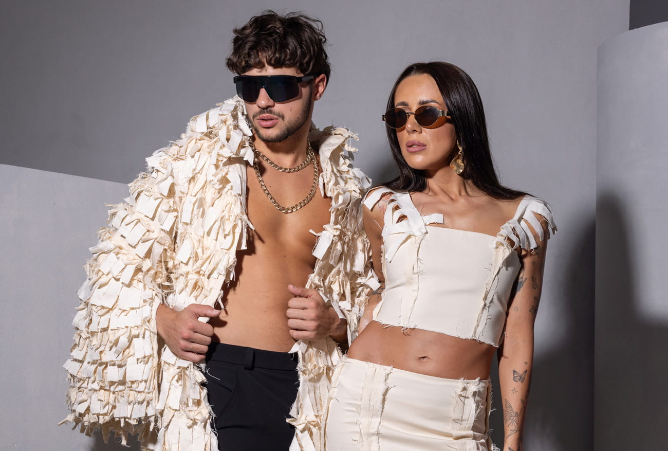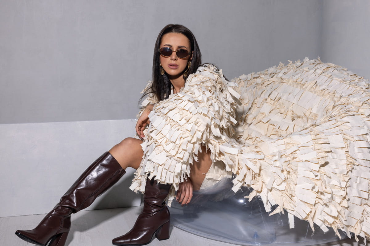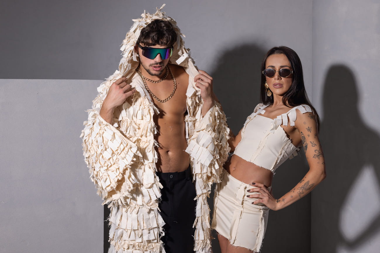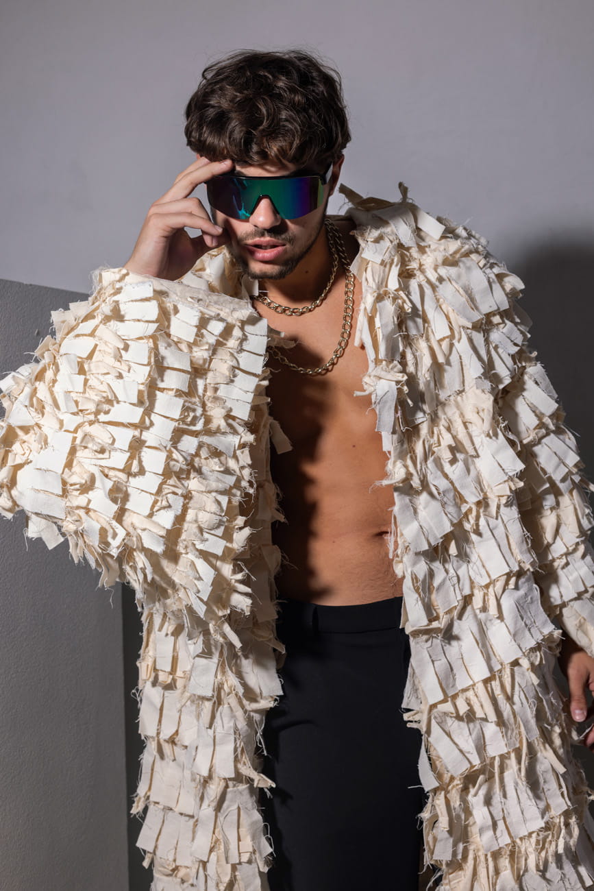 to projekt, który wymyka się tradycyjnym kategoriom mody. Powstał nie po to, by go nosić, ale by wyrazić ideę – surowe piękno, autentyczność i wolność tworzenia. To praca artystyczna, w której tkanina stała się formą wypowiedzi, a niedoskonałość – środkiem wyrazu. Długi, obszerny płaszcz z głębokim kapturem i szerokimi rękawami. Powstał z surowej bawełnianej tkaniny ciętej na pasy i frędzle, które układają się jak miękkie, nieregularne futro. Każdy element został uformowany tak, by zachować naturalny rytm i lekkość ruchu. Pod spodem – mini spódniczka i gorset z tej samej tkaniny, z widocznymi przeszyciami i surowymi krawędziami. Proste formy, szczere wykończenie, brak ukrytych detali – wszystko pozostaje autentyczne.
