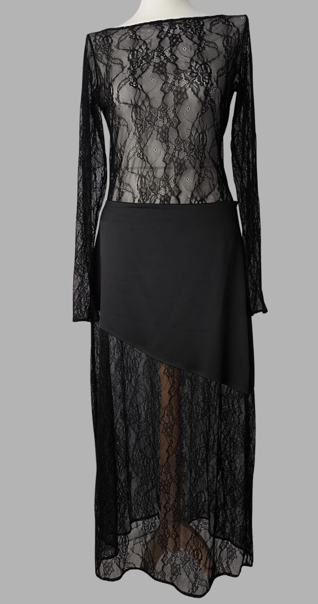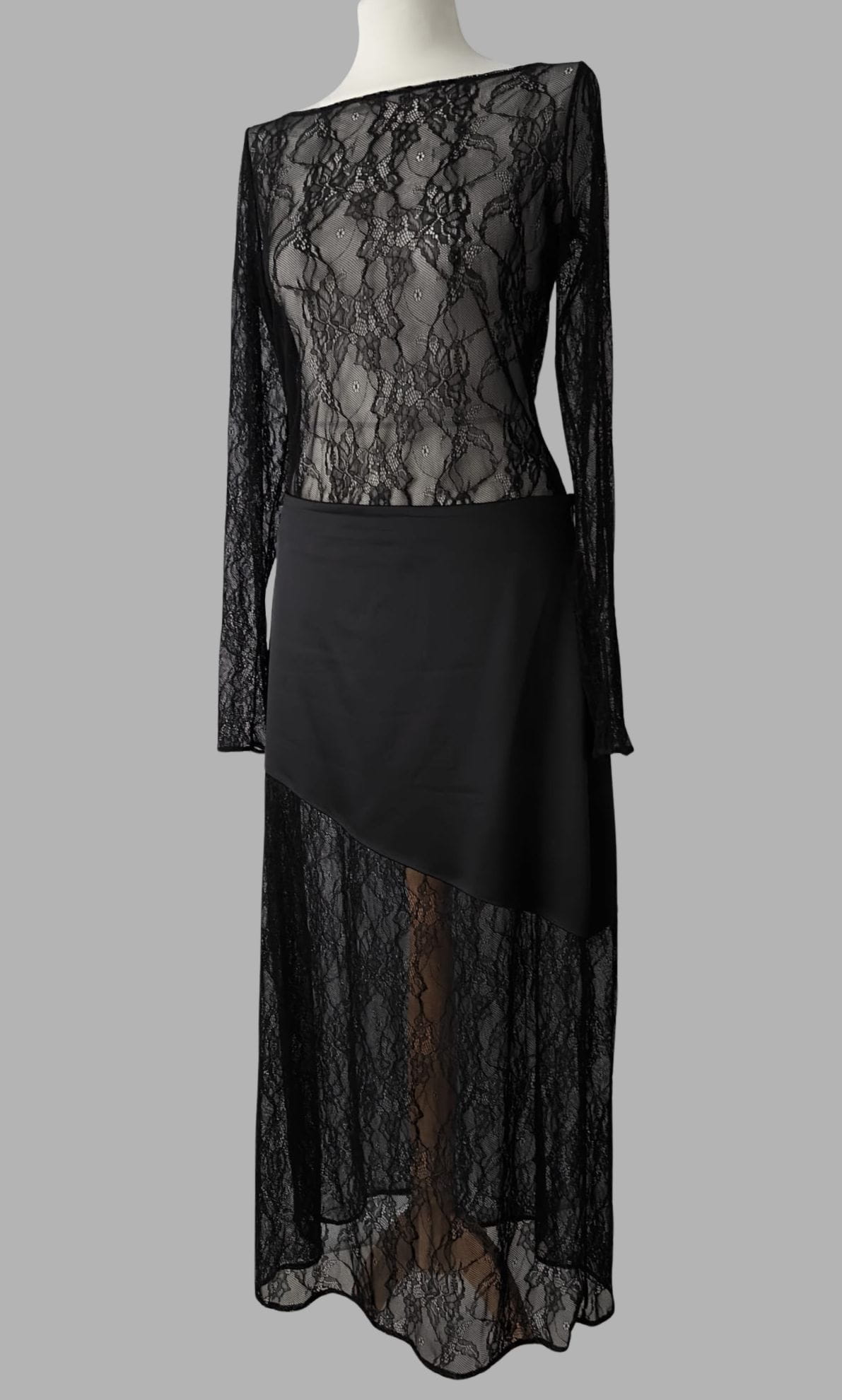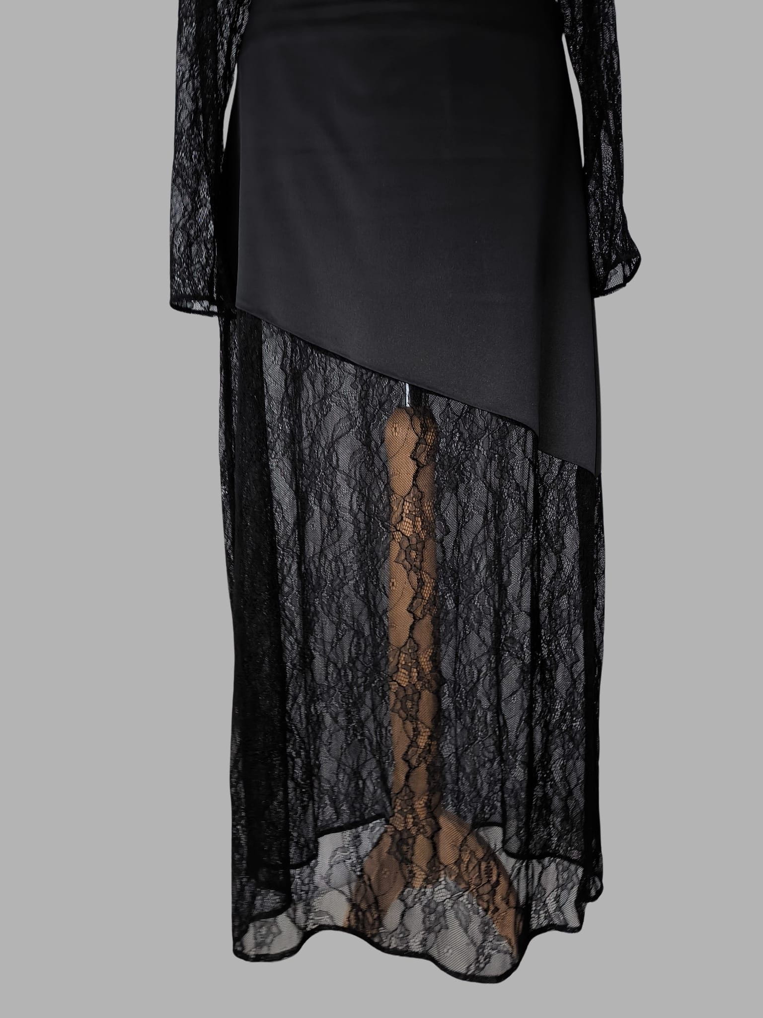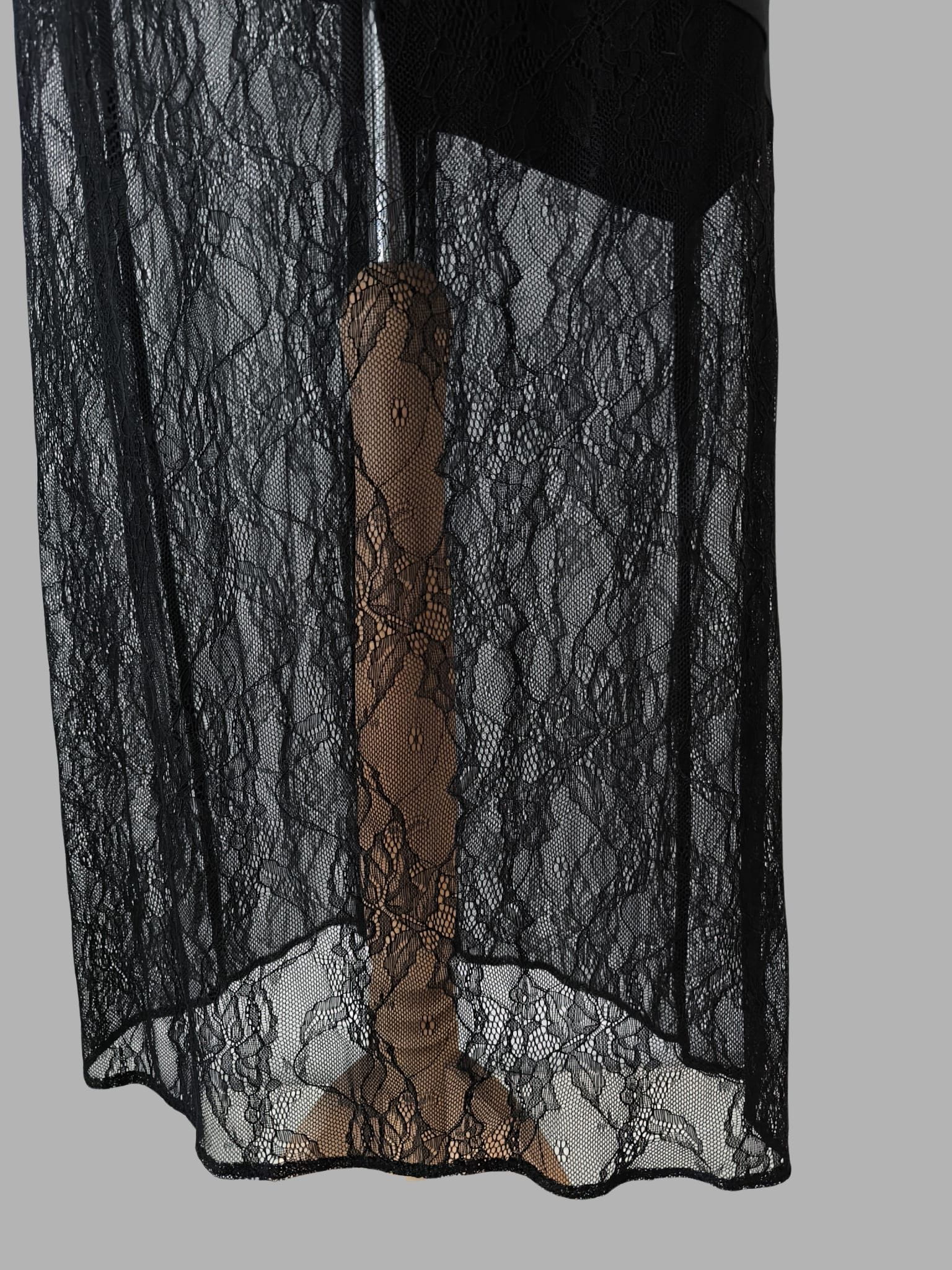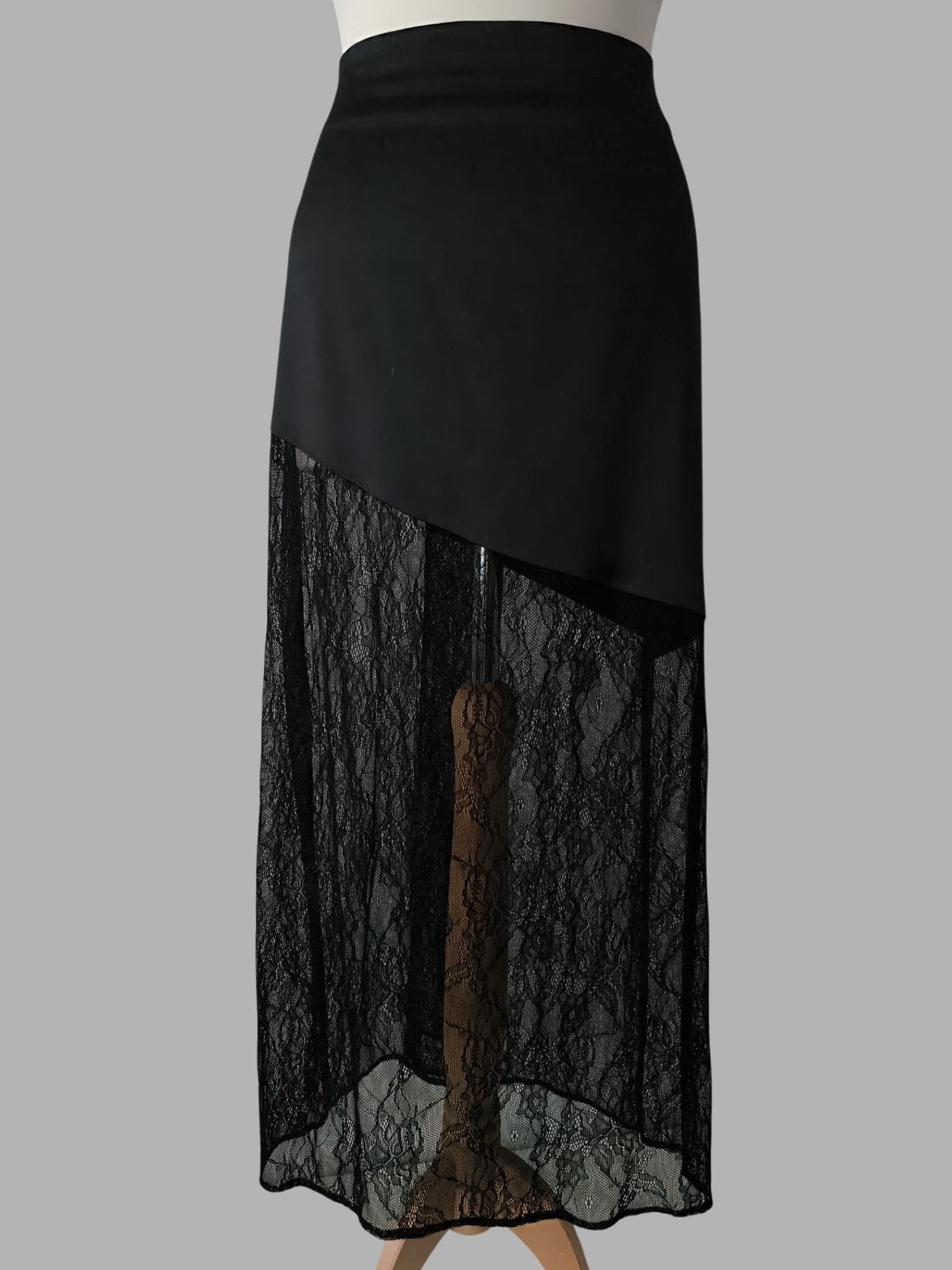 Czarna spódnica o satynowej górze z asymetrycznym cięciem, które subtelnie podkreśla sylwetkę i nadaje całości nowoczesnego charakteru. Góra wykonana z czarnej satyny, miękko łączy się z koronką po skosie, tworząc subtelną, kobiecą linię. Delikatnie, filuternie odsłania jedną nogę, podczas gdy druga pozostaje częściowo zakryta.. To wyrafinowany projekt, który pięknie łączy klasykę z romantycznym detalem i doskonale dopełnia zarówno minimalistyczne, jak i bardziej dekoracyjne stylizacje