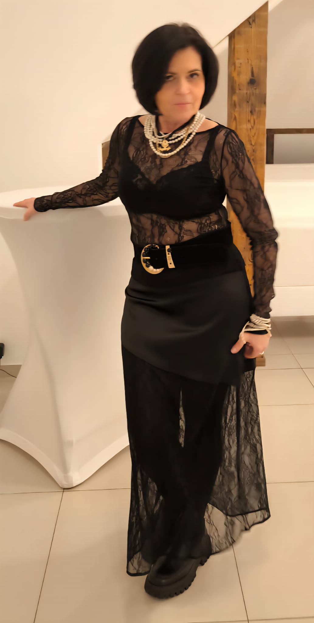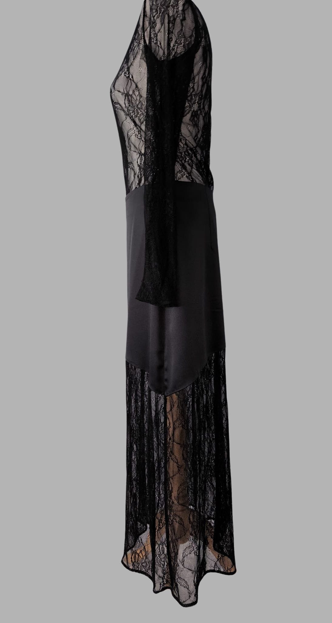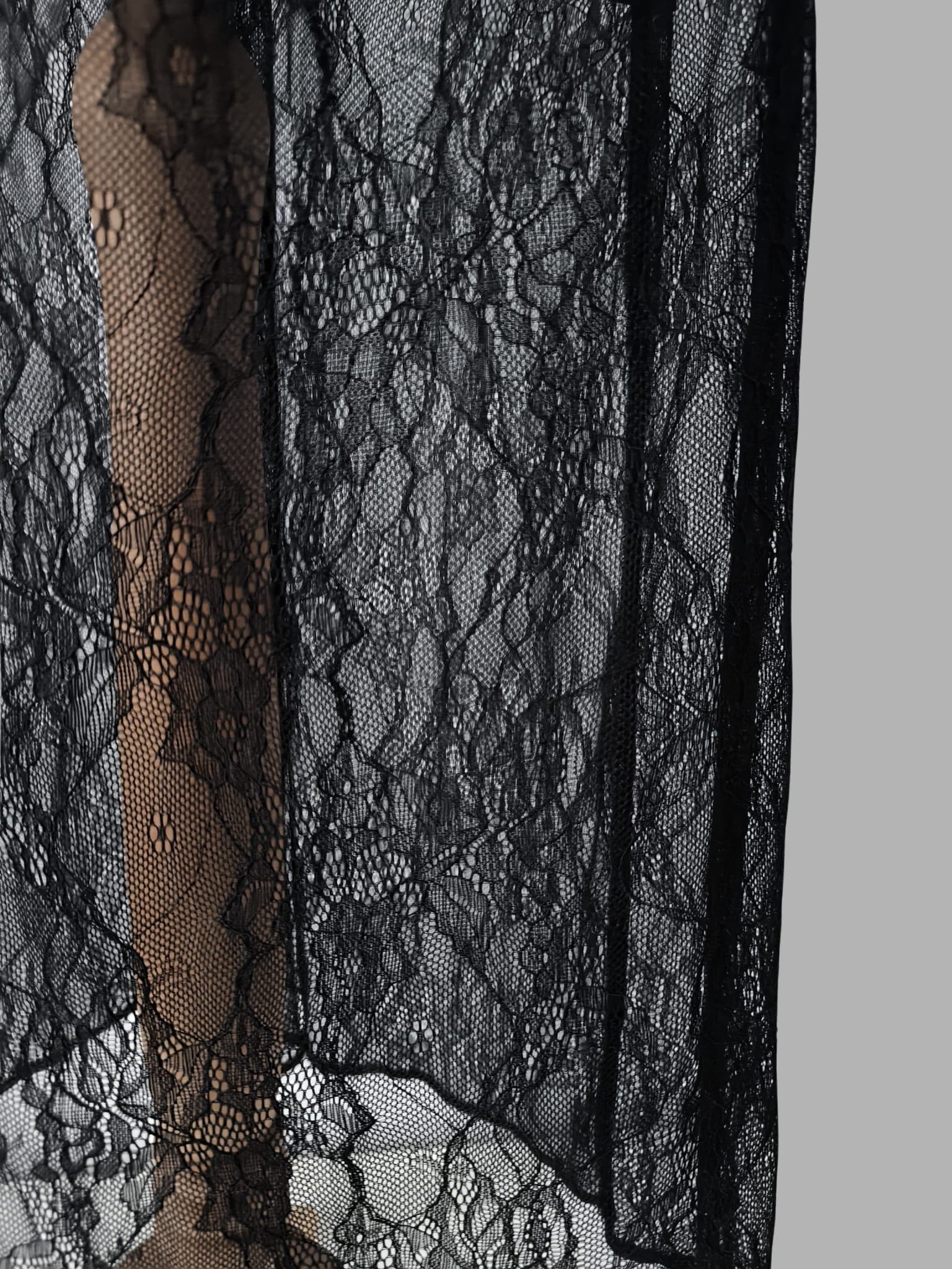 Do satynowej góry doszyty został kontrastujący, koronkowy dół, który nadaje projektowi lekkości i zmysłowości. Delikatna koronka subtelnie odsłania nogi, tworząc efekt warstwowości i eleganckiej gry faktur. To detal, który przyciąga spojrzenie, ale pozostaje wyrafinowany i ponadczasowy.