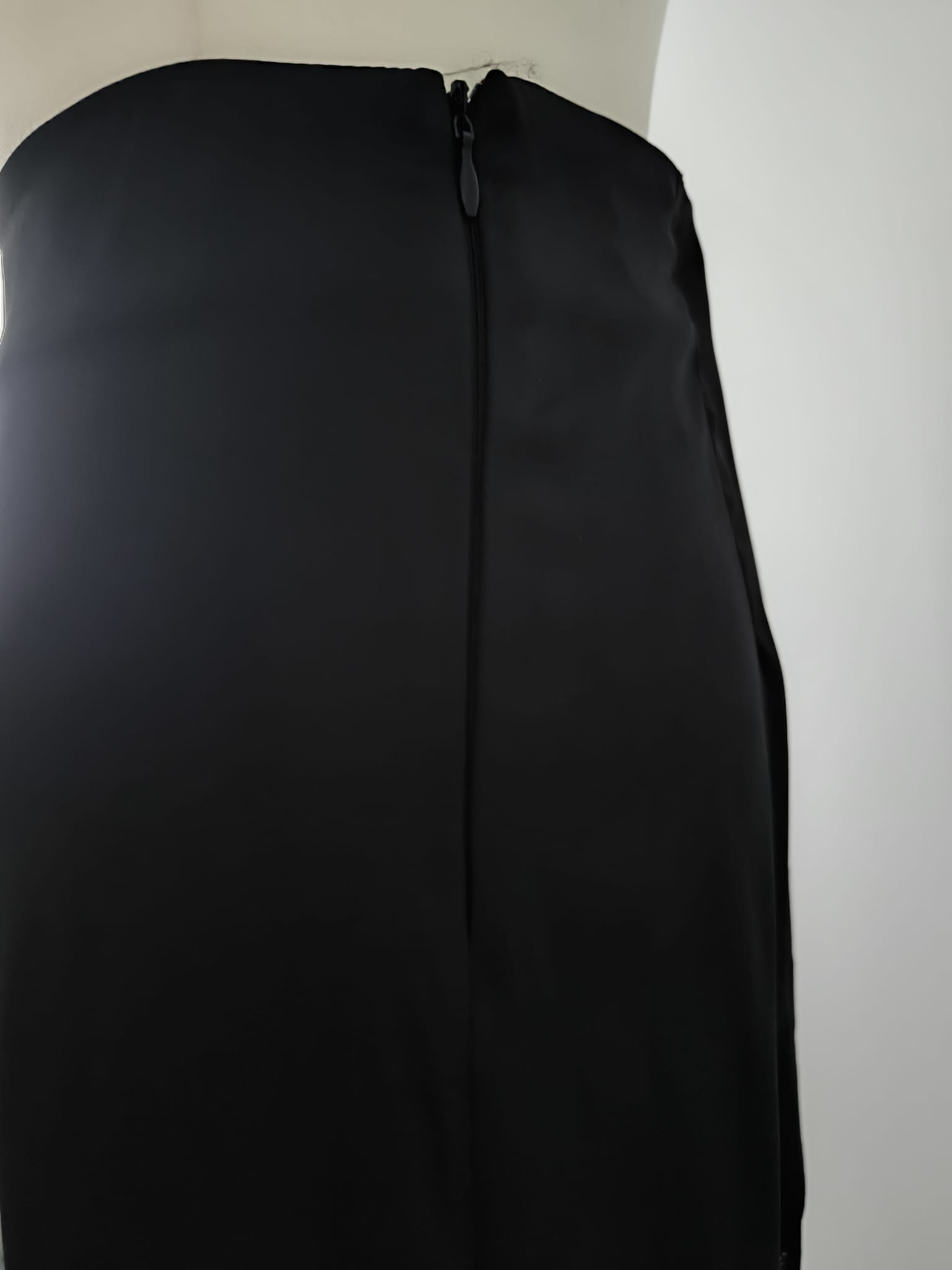 Ta spódnica to wyrafinowane połączenie klasyki i subtelnej dramaturgii. Górna część została wykonana z gładkiej, czarnej satyny, która miękko układa się na sylwetce i nadaje całości szlachetnego połysku. Asymetryczne cięcie przełamuje klasyczną linię, wprowadzając nowoczesny, nieoczywisty akcent oraz podkreślając ruch materiału.
