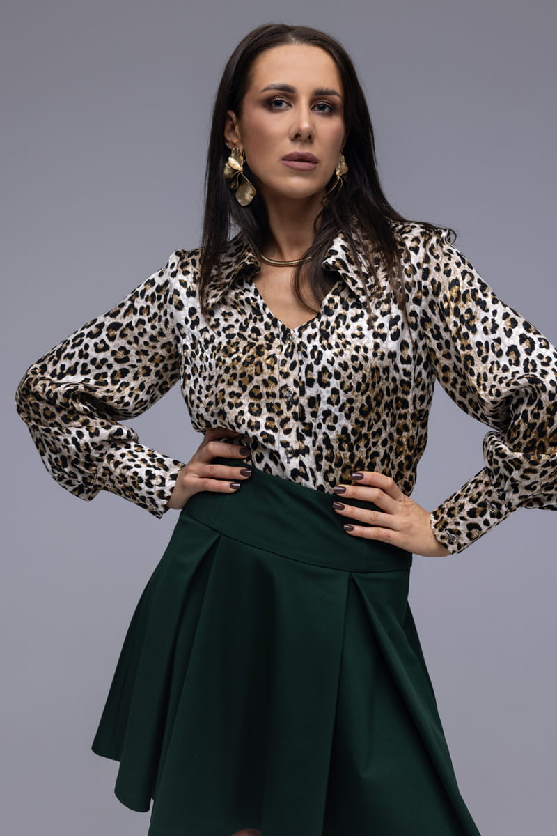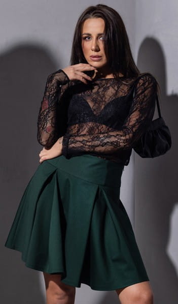 Krótka spódnica w głębokim odcieniu zieleni, sięgająca do połowy uda. Jej dopasowany karczek pięknie akcentuje figurę, a kontrafałdy nadają lekkości i swobody ruchu. Projekt inspirowany klasyką stylu preppy został przetworzony w nową opowieść – bardziej śmiałą, magnetyczną i świadomą. Spódniczka nie tylko wpisuje się w aktualne trendy, ale je wyprzedza – to element garderoby, który nadaje całej stylizacji osobowość: lekko prowokującą, pełną luzu, zawsze na pierwszym planie.