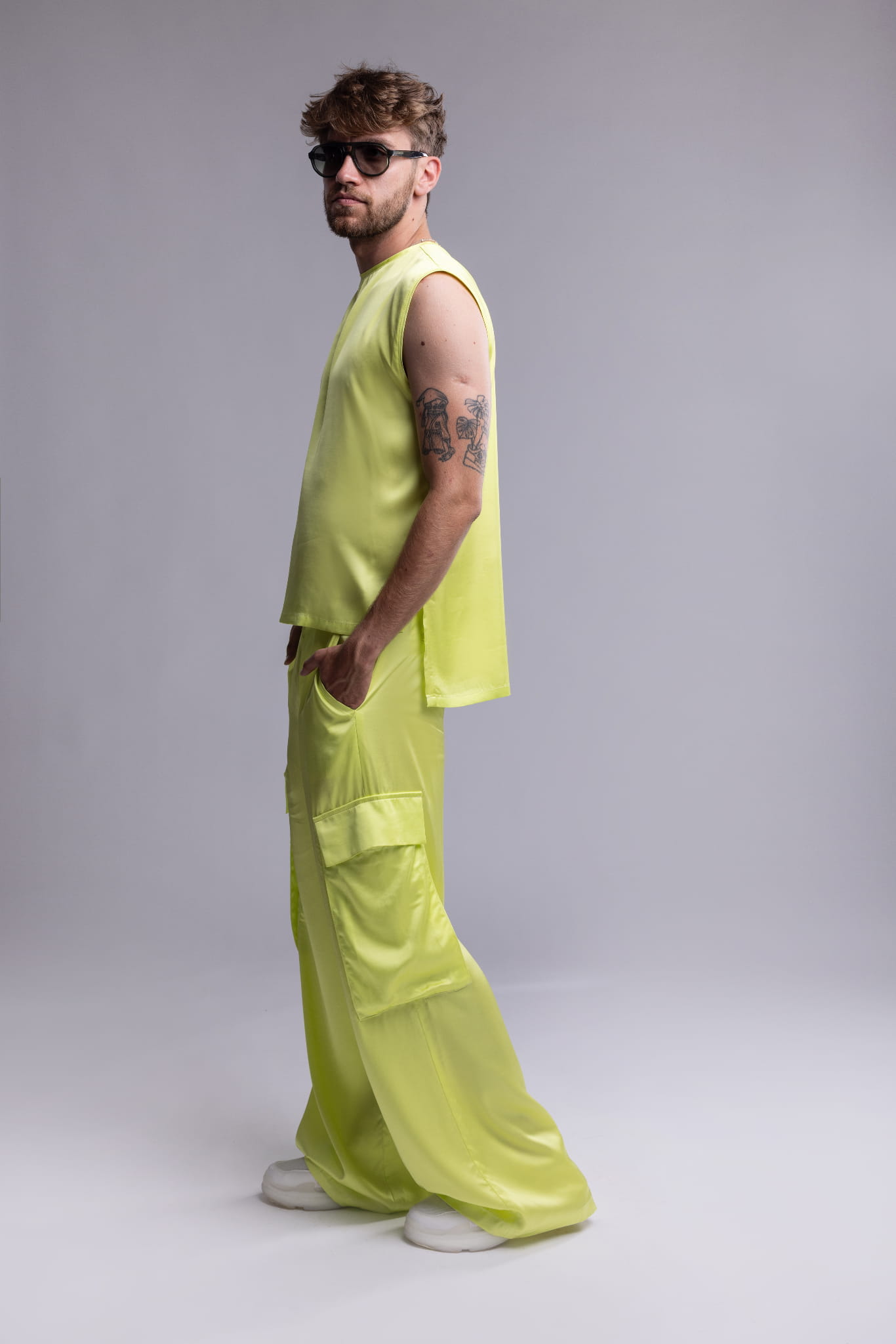 Na prośbę naszych Klientów, męskie spodnie w kolorze neonowej żółci dostępne są również bez naszywanych kieszeni na nogawkach. W wersji uproszczonej zachowują cały swój charakter, energię i kolorystyczny pazur, a jednocześnie zyskują na czystości formy i stylizacyjnej elastyczności.