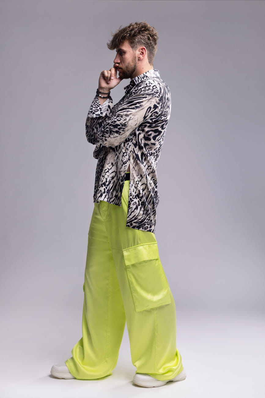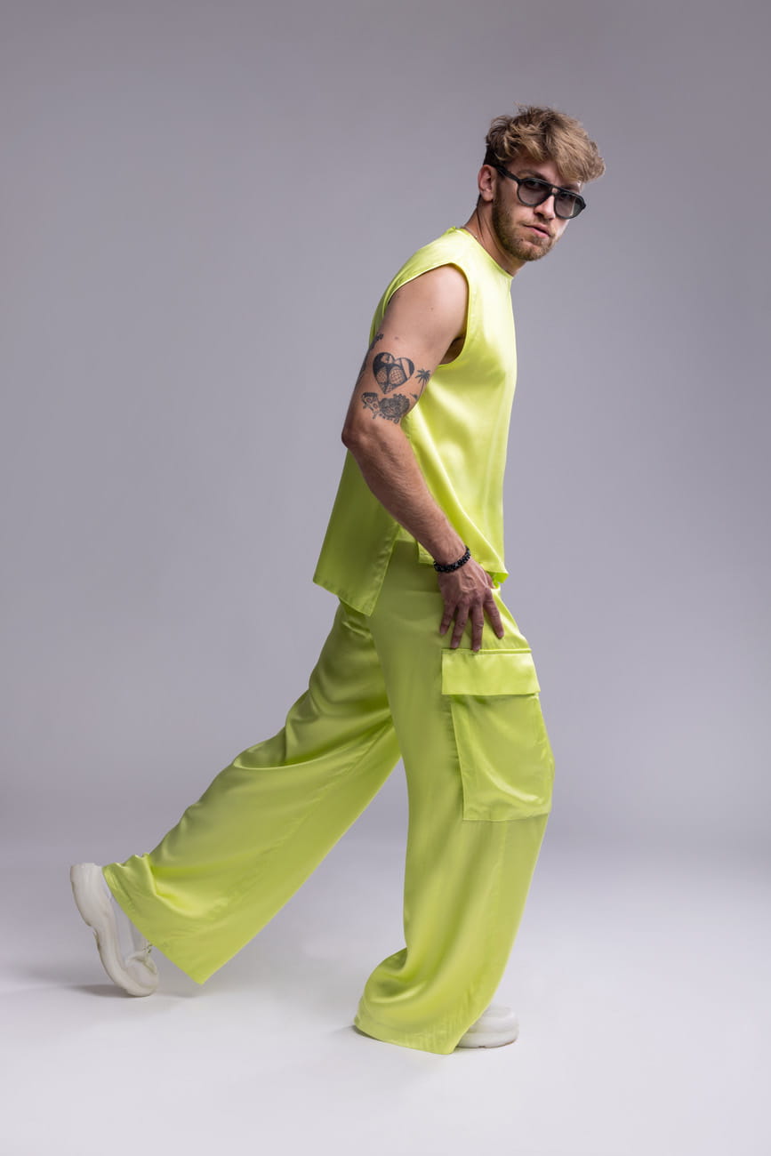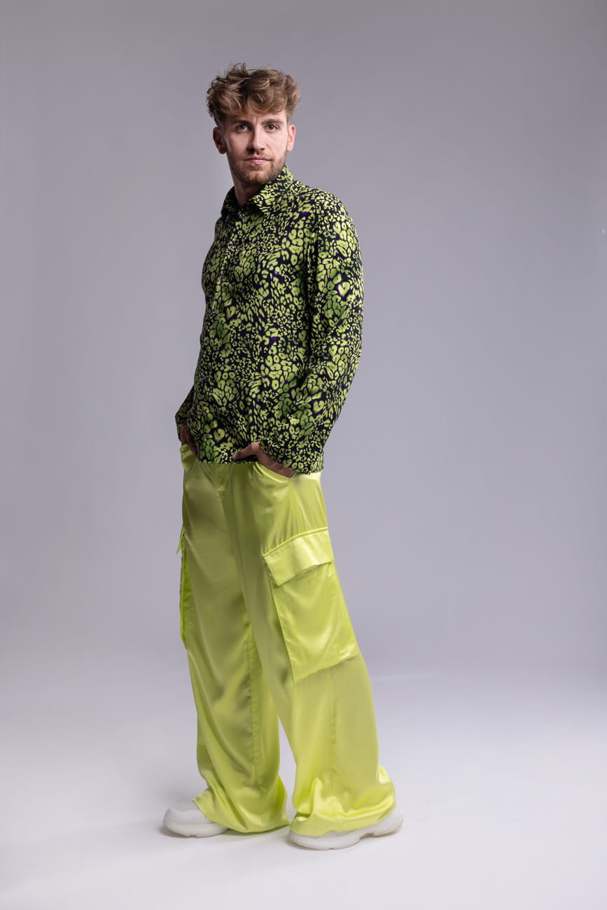 Spodnie męskie w kolorze neonowego seledynu o satynowym wykończeniu, szeroka, prosta nogawka i wyraziste naszywane kieszenie z patkami nadają im użytkowy, nowoczesny charakter. Po bokach znajdują się praktyczne kieszenie wsuwane. Uszyte z wysokiej jakości wiskozy – tkaniny lekkiej, oddychającej, idealnej na lato, wiosnę oraz ciepłą jesień.