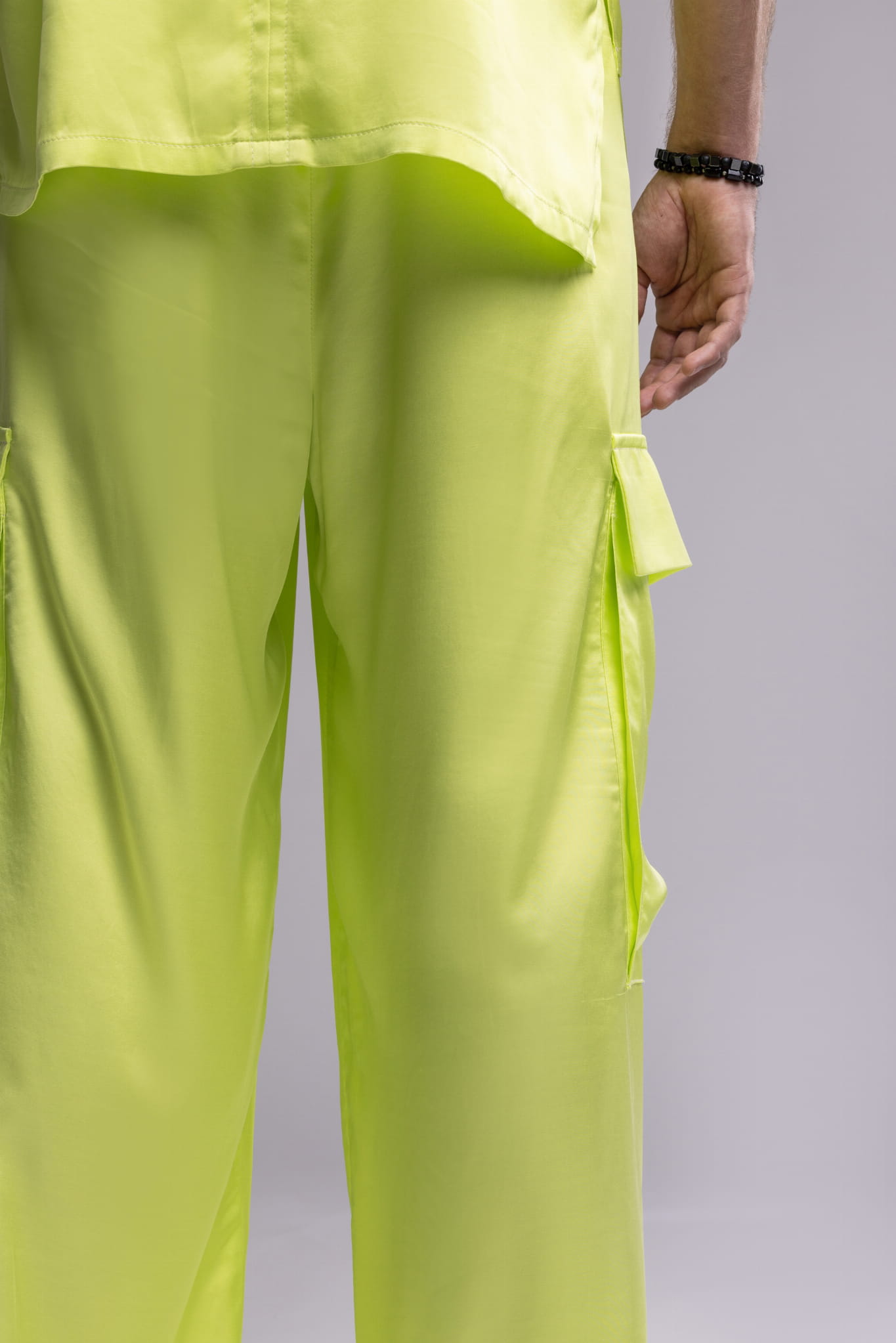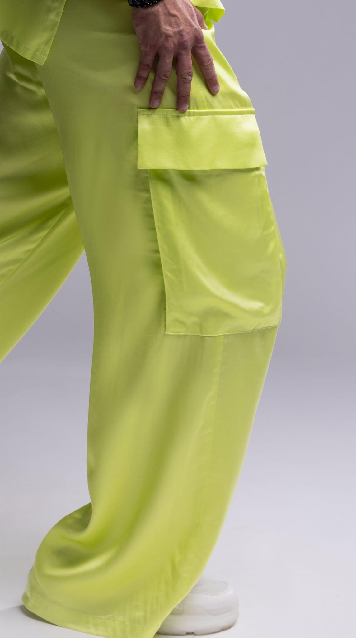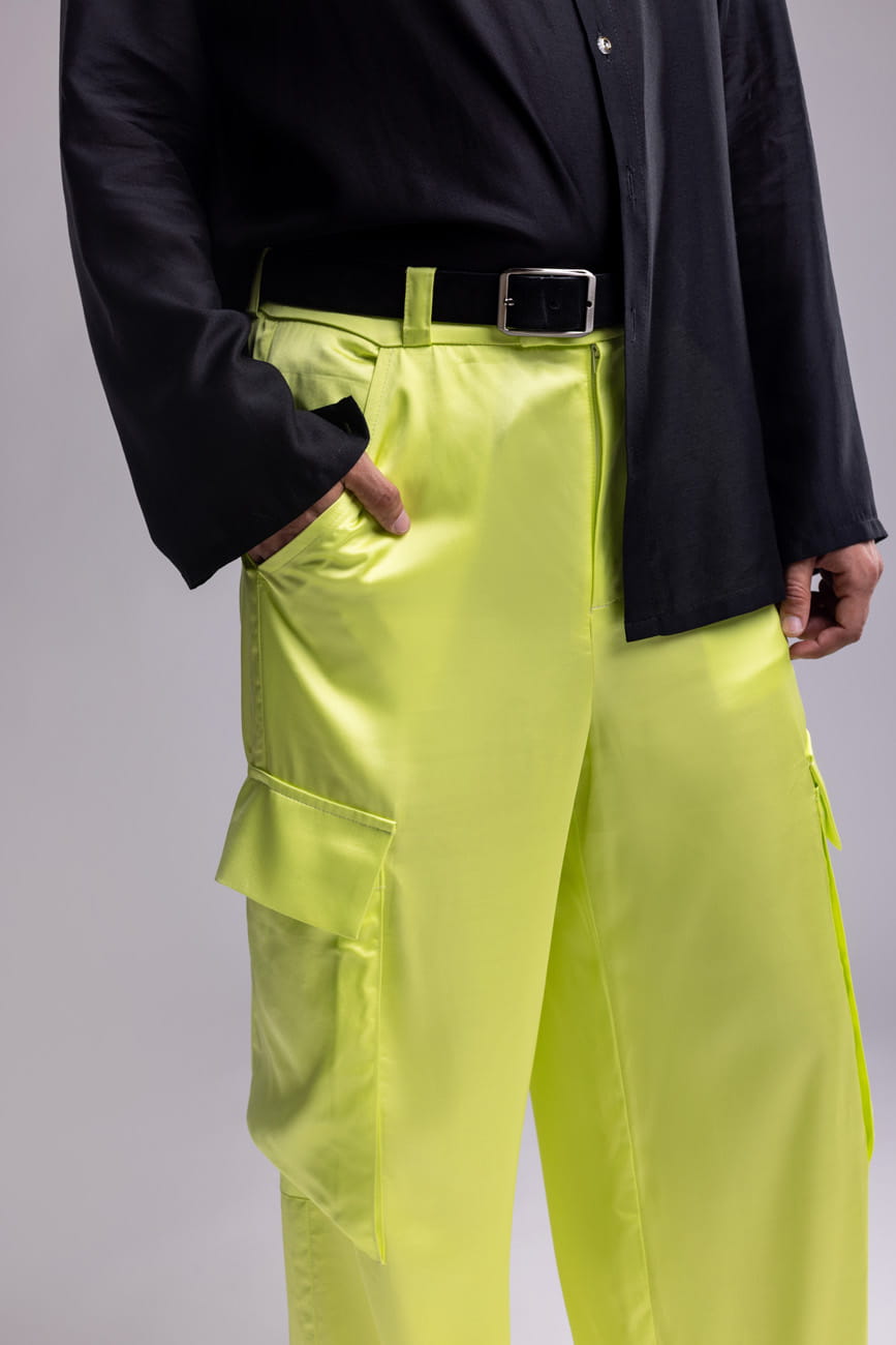 Spodnie męskie w kolorze neonowego seledynu o satynowym wykończeniu, szeroka, prosta nogawka i wyraziste naszywane kieszenie z patkami nadają im użytkowy, nowoczesny charakter. Po bokach znajdują się praktyczne kieszenie wsuwane. Uszyte z wysokiej jakości wiskozy – tkaniny lekkiej, oddychającej, idealnej na lato, wiosnę oraz ciepłą jesień.