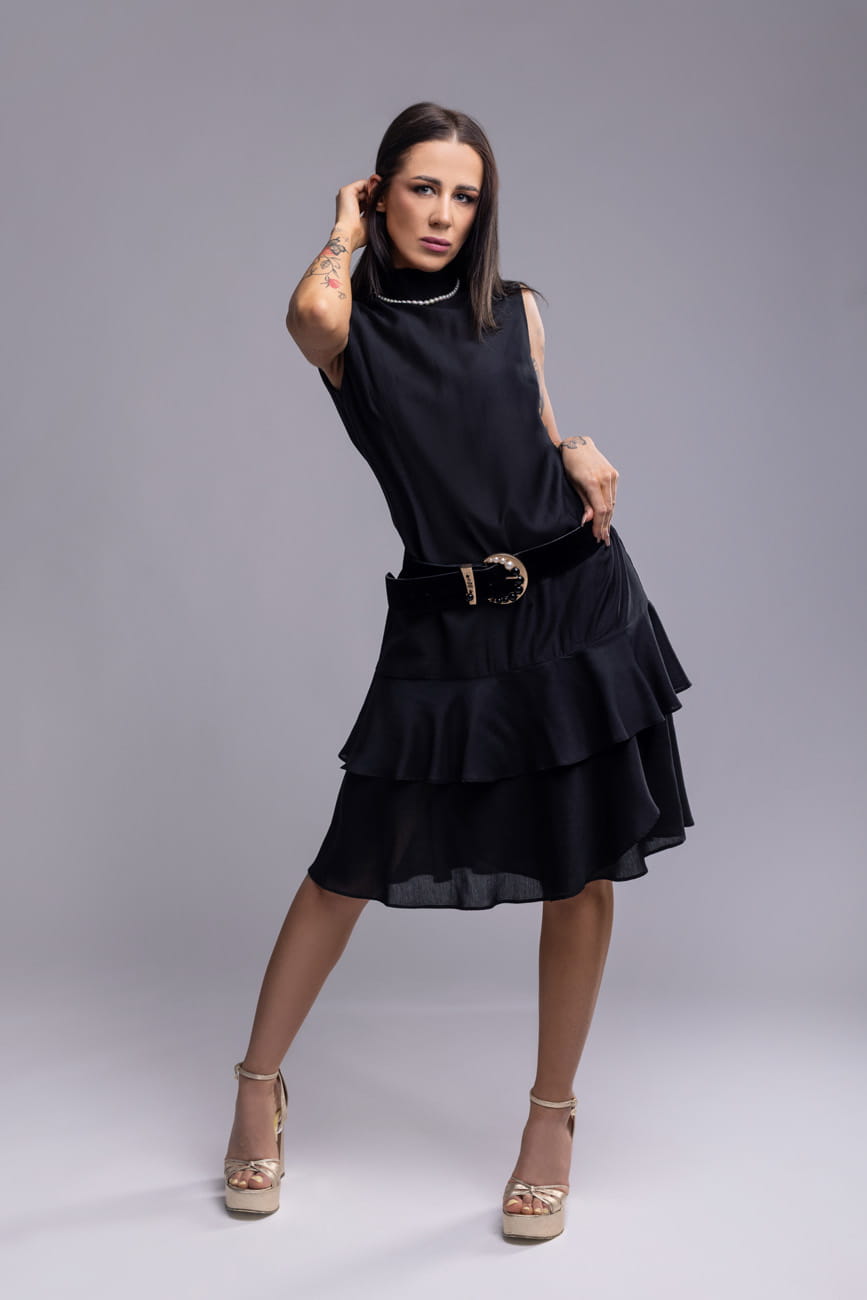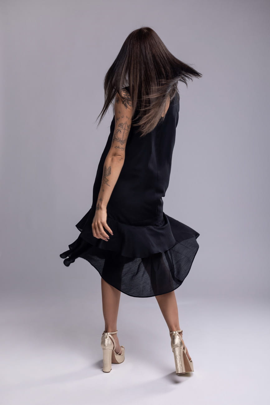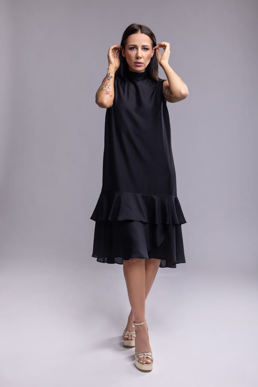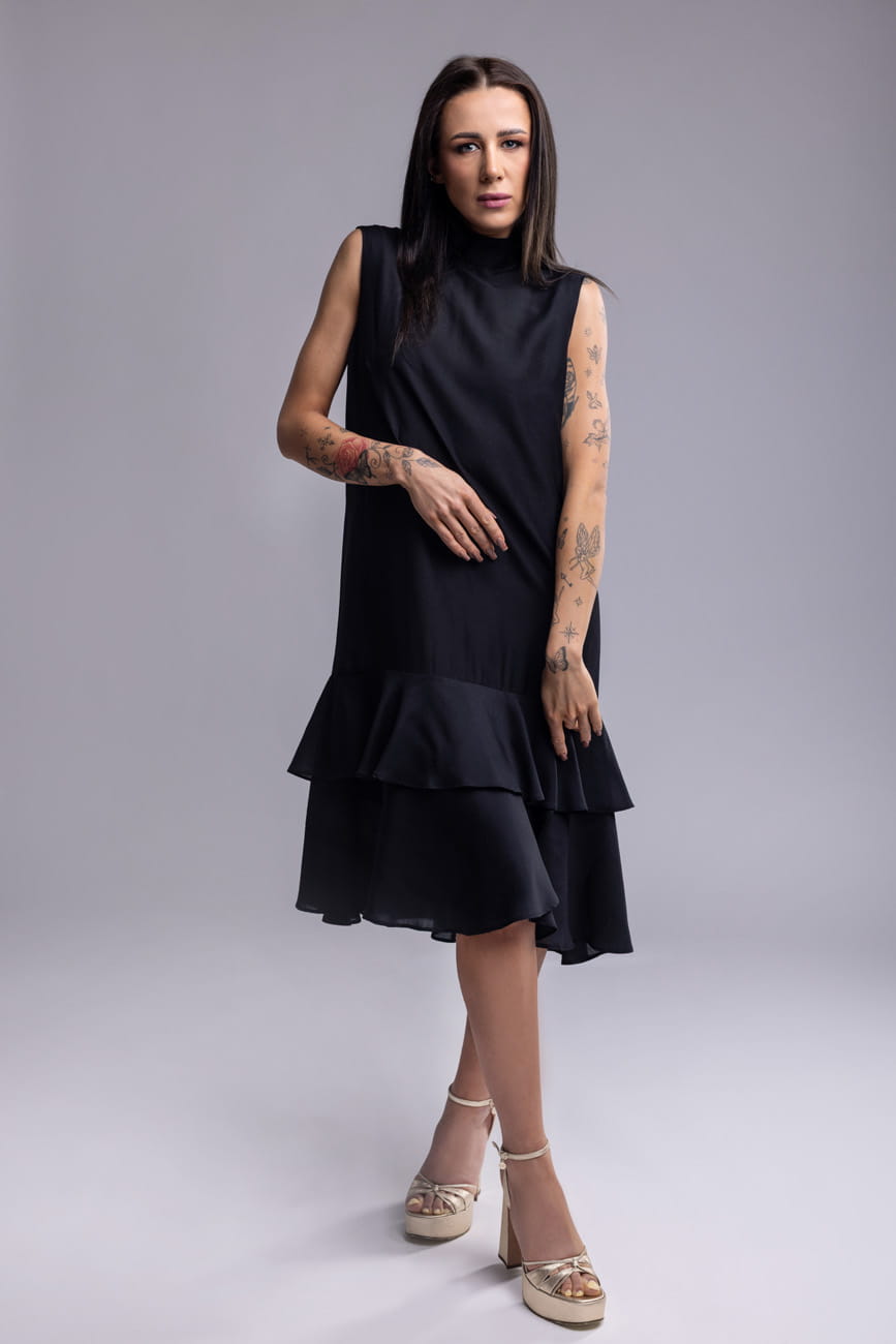 Czarna sukienka - Dark Mist, ulotna i tajemnicza jak mgiełka - lekka, elegancka i lekko zmysłowa. Bez rękawów, z delikatną stójką zapinana na dwa guziczki, prosty krój z falbanami szytymi z koła - łączy w sobie elegancję i lekkość z nutką retro. To sukienka, która porusza się razem z Tobą – subtelnie, płynnie, kobieco. Wykonana z przewiewnego, miękkiego lyocellu otula ciało subtelnym połyskiem, a falbany dodają jej ruchu i finezji.