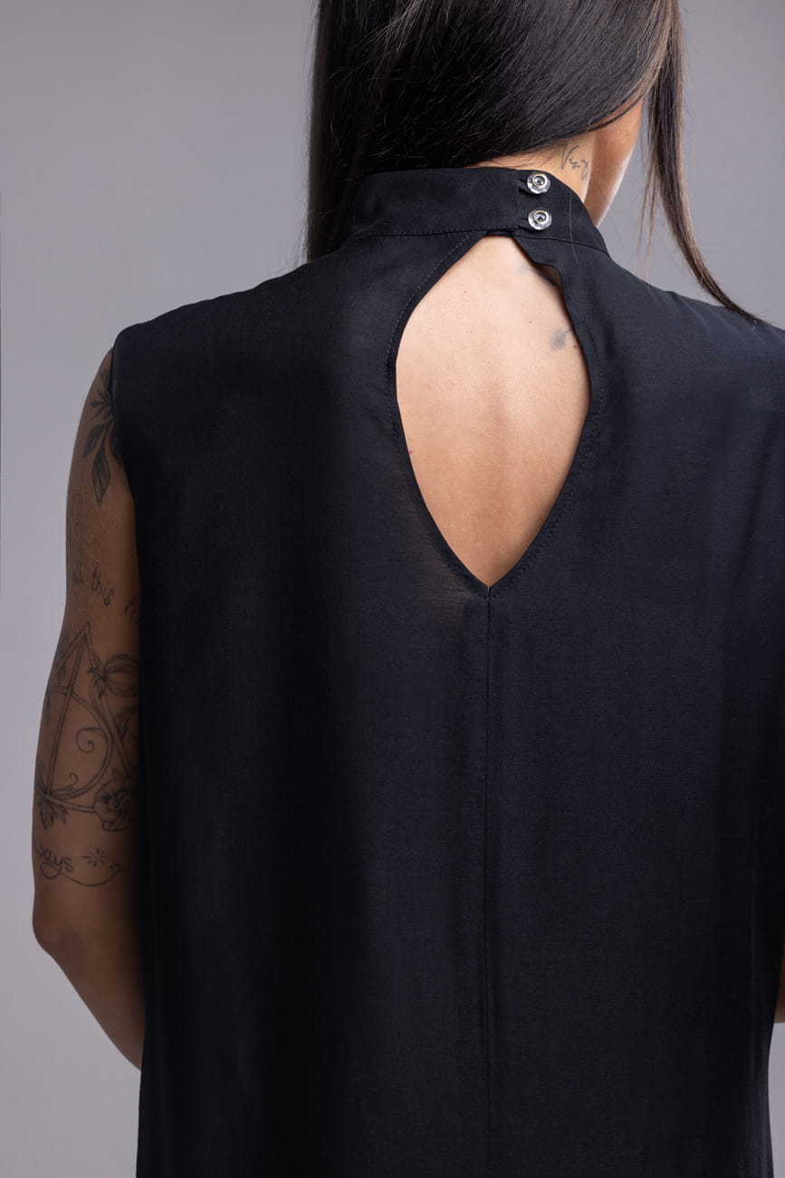 Stójka zapinana na dwa subtelne guziki tworzy piękny dekolt na plecach w kształcie łezki i wprowadza nutę minimalistycznej elegancji. Brak rękawów nadaje lekkości, dół sukienki składa się z dwóch asymetrycznych falban – szytych z koła, co sprawia, że materiał miękko faluje przy każdym kroku.