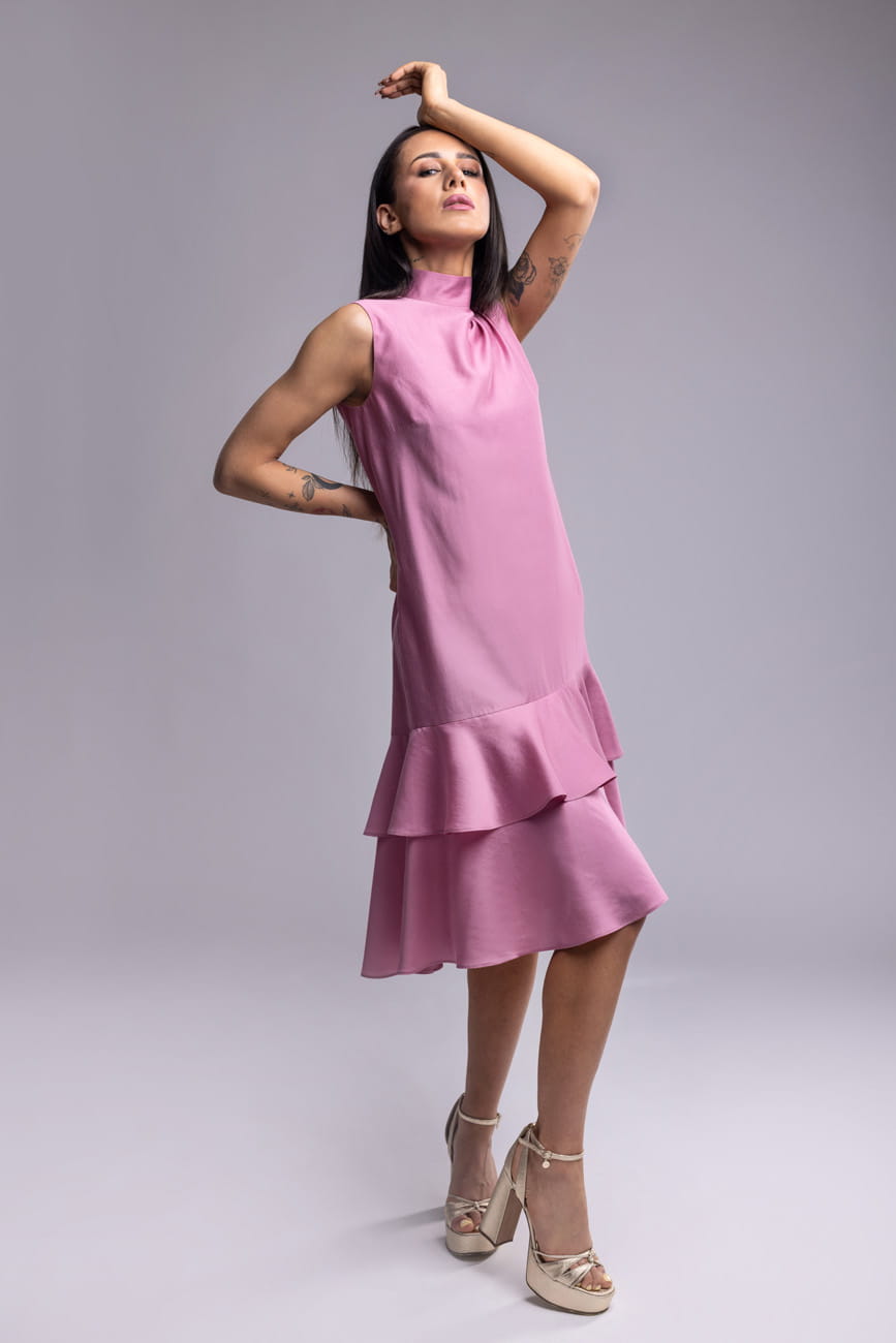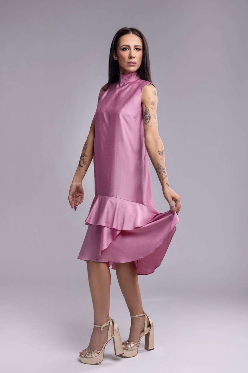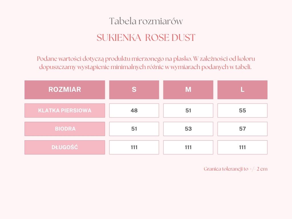 Sukienka Rose Dust to propozycja w odcieniu brudnego różu, uszyta z lekkiego, oddychającego lyocellu. Fason inspirowany latami 20. – prosty, bez rękawów, z delikatnie poszerzanym dołem wykończonym podwójną falbaną. Elegancka stójka zapinana na dwa guziczki dodaje wyrafinowania, a długość za kolano i subtelna asymetria sprawiają, że model pięknie układa się w ruchu. Idealna na wyjątkowe okazje.
