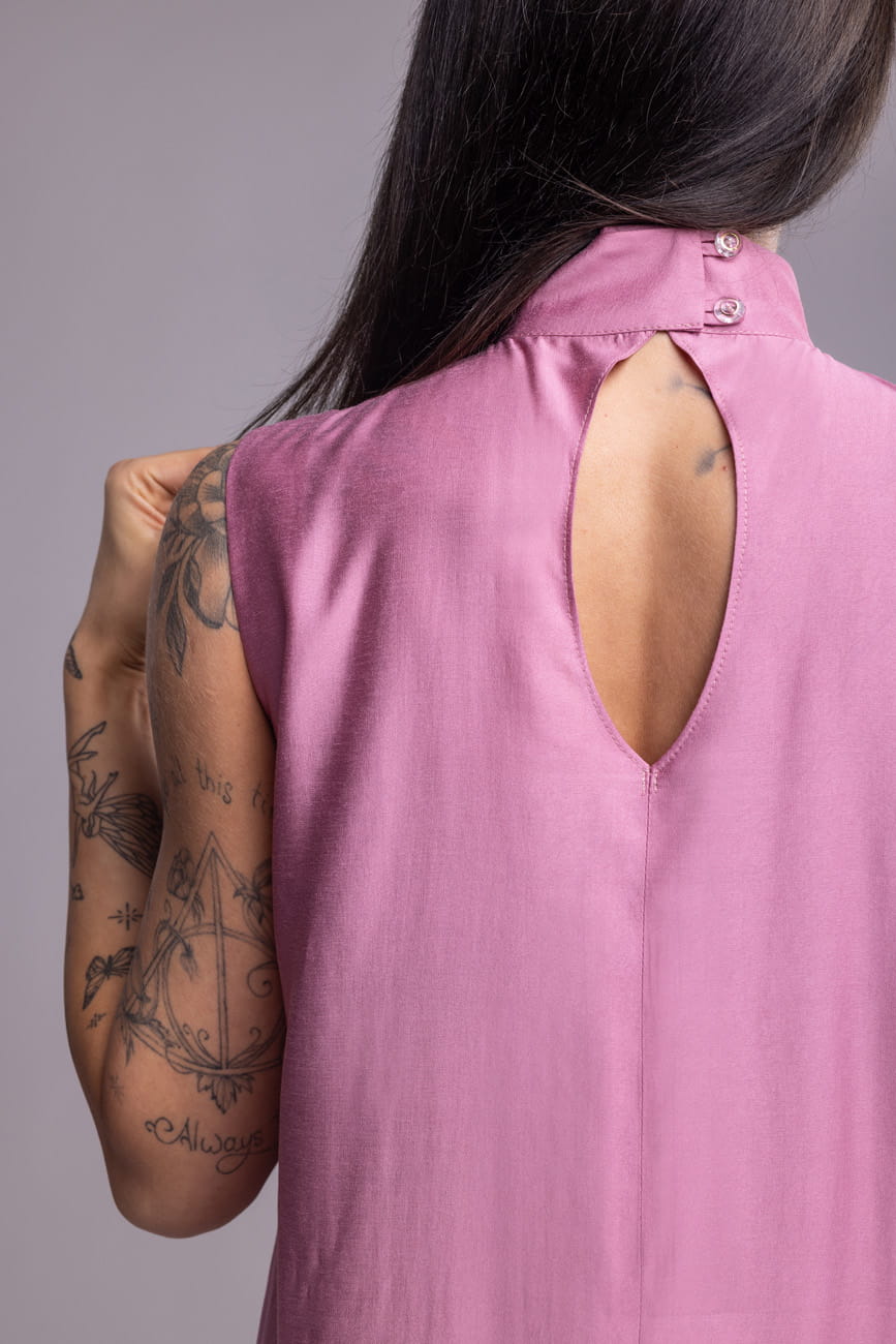 Bez rękawów, z klasyczną stójką zapinaną na dwa guziczki, z delikatnie przedłużonym tyłem i dwiema falbanami uszytymi z koła, Rose Dust łączy w sobie elegancję i lekkość z nutką retro.